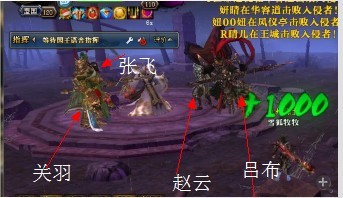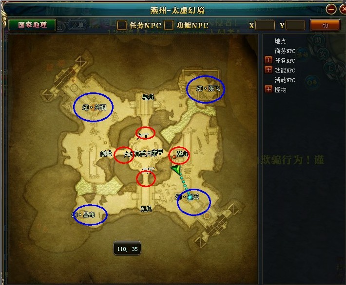 首先,地图一张,献上 红圈——出怪位置,篮圈——小弟位置(干掉以后就叛变成为你的小弟可以助战) 介绍一下,4个小弟分别是: 关羽(中招者,被“绑架”完全不能还手,只能到处跑) 吕布(中招者,无限中毒,一次毒我4000+血左右,无路可逃) 张飞(被动技能,提升攻击力) 赵云 (中招者 降低防御) 相对于来这,里面最好打的是张飞,这些小弟,本来伤人(伤我120霸刀7星绿套)700+,就算上了状态也才打我1000+。 也许是因为赵云穿了盔甲,而张飞是光这膀子的缘故,所以砍张飞比赵云容易,所以果断砍了赵云(奔着试试水深的心态,这一轮,俺把4小弟全部收了)干掉了小弟得的是什么呢? 看图,注意,是有时间限制的,在时间内使用,你就可以召唤这些武将帮你战斗,虽然他们对怪,不产生伤害,但是可以帮你分担伤害,(他们的状态只对小兵有用,对最后的BOSS是无用的,在怎么说他们是背叛的,怎么可能对自己原来的主公用技能嘛,产生伤害嘛,所以他们只能“背钢”(挨揍的意思)) 最后的“真武大帝大大BOSS”只有120级的280W血哦,其实也不难打,4个小弟上,你在旁边放暗箭即可,然后就过了。 说最后的重点,当有人血低于60%左右的时候真武大帝可是会趁你病要你命的哦,放那个(太快,没截图··周围一圈放箭,基本3W-5W的伤害,所以,血少了就跑吧) 附带一张看起来NB图图 这技能中招,就虚弱·攻击,物防法防统统减半 流程结束,本人还会继续完善,期待大家给意见,给图,提出我的漏洞,好让牧牧修补。 [编辑:天行]
