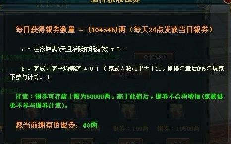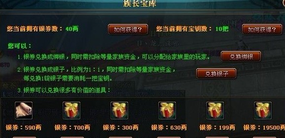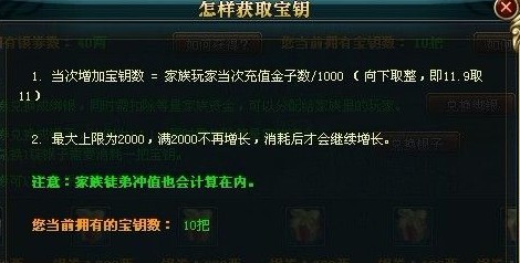 以新区满编50人家族,平均等级65,活人40个计算。10*4*6.5=260L银券。 只要有人冲1000金就可以拿到一个宝库钥匙。 怪不得我们家族长说战车坏了跟他说一声就行,他给我们修。