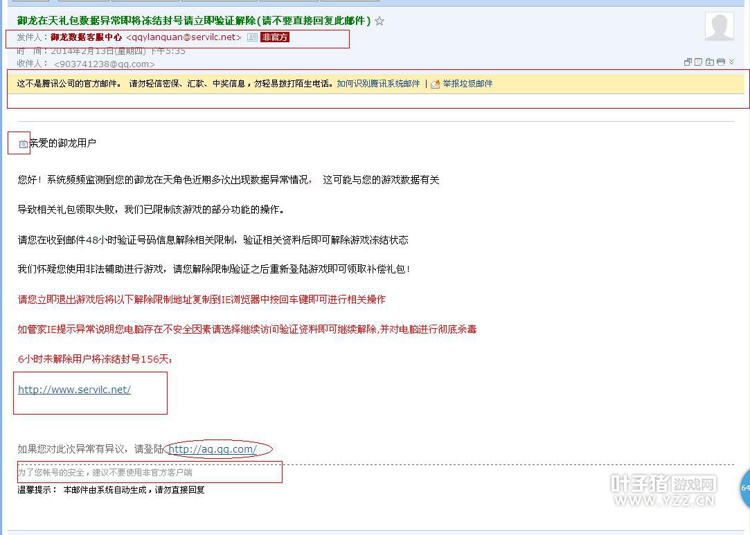 昨天小记在玩游戏热火朝天的时候QQ邮箱来了一封邮件,一看它提示的是下面的内容! 不由自主的点了上去,提示了这个内容! 上面写的头头是道,我一个资深玩家都感觉可信度很大,特别是那些新手,肯定会点上去!但事实不是这样。我所画出的分块是骗子的漏洞!!那个椭圆形就是真的官方网站,一般人都会点官方网站。但点了骗子提供的网址就会出现下面这个场面! 继续点,又提示了这样: 此骗术即是利用大家普遍对账号安全的敏感意识,以及对账号冻结的愤怒意识,谁见了自己账号要被封停都会气氛的想申诉,于是很容易被盗号骗子利用。希望大家可以管理好自己的号,注意虚假信息,提高警惕,防患于未然! 叶子猪记者——真昔爱 [编辑:天行]