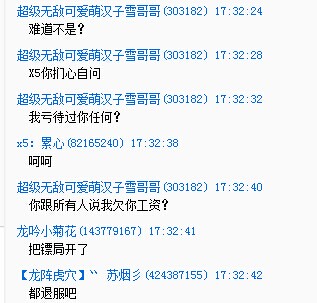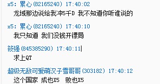 这个是X5的截图,表明当天下午5点有曾和女王打过招呼,但是并没有得到回应的消息。 然后从盗号,扯到发工资。O(╯□╰)o话题转移太快小记还是截图吧。 女王频繁爆粗口,小记表示有点不太习惯,毕竟从未接触过此人。 再从合区后扬州的那场国战开始扯,说X5那场国战输了,小记作证呀,那场国战是龙吟龙域三国志线下聚会,X5根本不在,指挥都是二流在死撑,输是必须的。 聚会此事女王知情,但是不知道这么扯是有何用意,小记的脑袋生锈了转不动了 众所周知,X5在群雄征先扬州并没有自己的号,都是上的女王的号来进行指挥的,但是女王提出X5的号装备小记有点不能理解了。 再从盗号事件扯到这个国家成也X5败也X5,女王呀,人家不过是个被你雇来的指挥,给多少钱,办多少事,我觉得这是很正常的 ,何必说出一种人家辜负了你的感觉? |