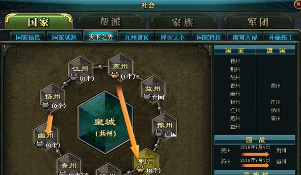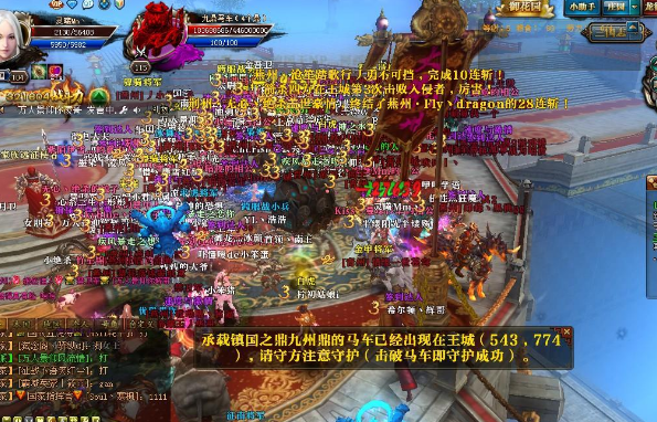 【势如破竹】进入了120级封印,战斗开始进入白热化阶段。荆州人面临的战斗尤为激烈,因为他们已经拥有八个大鼎,多次冲刺燕州的第九个鼎都没有成功。与此同时,燕州人也对荆州的八个大鼎虎视眈眈,激烈的斗争一刻不停! 燕州与盟国青州的总体实力和荆州旗鼓相当,经历了几次较量,各国勇士们越战越勇。7月4日,燕州又发动了进攻荆州的国战,他们目标依然很明确,那就是大鼎。指挥在QT上不断鼓励战士们积极参与,因为一旦夺得荆州的八个大鼎,燕州也可以完成九鼎荣誉! 这样的战役对荆州而言是压力比较大的,毕竟他们是以一敌二,不过依卡看见了荆州对这场战斗的重视。才过6点,指挥官就到处联络,让荆州的伙伴们尽量都来帮忙,高战号要保证全部在线,同时指挥准备了多套战斗方案。 出鼎的关键在于内城的四个BOSS,特别是战车神兽,一旦被击爆,守方将变得很被动,所以今天荆州把火力集中在守护白虎与青龙上。果然,大批燕州战车压上荆州大鼎。今天的燕州战车的数量多得让人吃惊,看来为了今天晚上的国战,他们也发动了全部力量,誓要把白虎打残血。同时这场战斗让御龙玩家感受到了斗智斗勇的激烈,双方都启动了007去提前击爆留血的BOSS。第一波战斗燕州打得很漂亮,趁荆州严守战车时把神兽朱雀与玄武双爆,并打下国家神兽15%的血量。 但荆州很顽强,他们迅速回防,让燕州在朱雀和玄武上没能再次占得先机。于是燕州再次大规模用战车进攻,很快击爆了白虎,这让荆州人开始手忙脚乱。虽然荆州人快速把白虎抢回去了,但是青龙又失守了。最终荆州国战防守失败,燕州取得国战胜利,荆州的大鼎危险了! 就在此时,戏剧性的情节出现了,荆州抢夺的四个大鼎到了归还时间,系统自动将四个大鼎归还给了原来的国家,这也就意味着最激烈的九鼎之争瞬间不存在了! 尽管如此,双方还是竭力投入战斗,当拉着大鼎的马车出现时,荆州王城人头汹涌,技能闪动,燕州与青州不断猛砍,努力击杀守卫大鼎的荆州玩家。荆州人真的很勇敢,全都主动参与包围大鼎,用鲜血来捍卫国家的尊严,最终荆州守鼎成功,燕州没有拉走大鼎,无功而返!