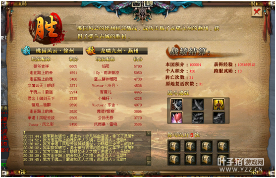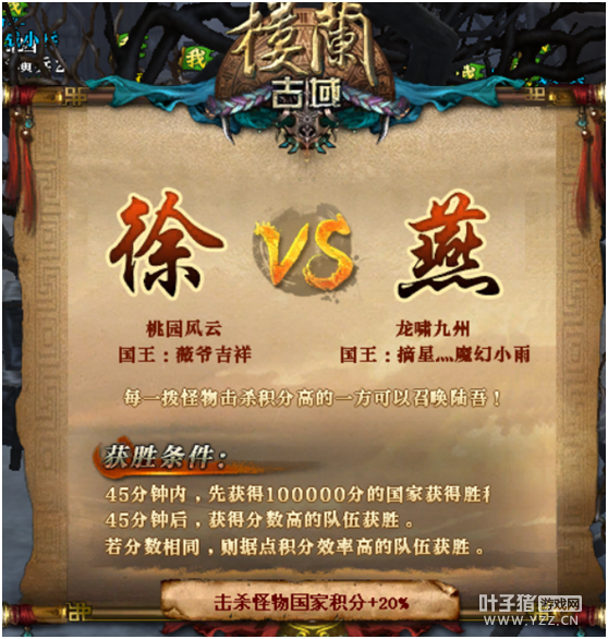 每周五的楼兰的战场无疑是最让玩家向往的大型跨服战场活动,各服务器的国家齐聚一堂,以神像占有度的高低匹配低手,更是让双方基本处在一个势均力敌的水平上。今日,讲说的就是桃园风云的徐州与龙啸九州燕州的激情楼兰战。 在倒计时结束后,双防都迅速冲向了中间雕像,在打掉拦路的枯木后,双方第一时间围绕着中间雕像进行了争夺,中间雕像处瞬间化成绞肉机。随后双方的战斗慢慢扩散到四周,当全部雕像都被占据之后,徐州却是落后燕州几百积分。 但由于徐州积分咬的很紧,燕州拉不开积分差距只能努力维持。到了第一波刷怪的时候后,徐州第一时间发现了怪物刷新在燕州的家门口,以最快速度汇聚了过去终全收了第一波怪物的积分反超燕州万余分。当怪物被击杀后又进入到了雕像的争夺中,但徐州一直保持领先优势。 第二波怪物刷新后,又是徐州神率先发现并将积分收入囊中,此刻已经与燕州拉开了很大的差距,燕州似乎知道难以追上故放弃战队都,最后徐州击杀完第三怪后获得了胜利。
