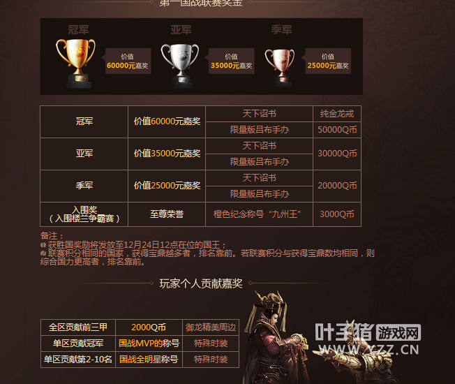 国战联赛,已经持续了三个月,终于落下了帷幕。第一名是龙啸九州的或许丶不懂,第二名是逐鹿霸业的妖孽,第三名是龙舞四海的犟半仙。可以说,这一次的国战联赛还是杀出了黑马的。因为其实很多人都会认为,第一名的龙啸九州毋庸置疑,但是很多人都认为第二名应该是桃园风云的辉煌+谎言组合,第三名待定。但是万万没想到的是,他们合国了。第二名的妖孽和这次的第三名犟半仙,都可以说是黑马出世,他们的合国,甚至是灭国,都让很多人意想不到,直接抢走了前三的位置。不过怎么说,这一次都是不算亏的。因为每个区的第一名,国王可以拿到3000QB。而国战联赛胜利之后,第一名可以拿到5Wqb,第二名可以拿到3WQB,第三名可以拿到1Wqb,可以说,这绝对是免费的好礼,很多人都说,终于大放血一次了!啥时候小编也能得到那么多的免费QB呢?好期待啊! 了解更多相关信息,请前往http://ylzt.yzz.cn/ [编辑:博博]