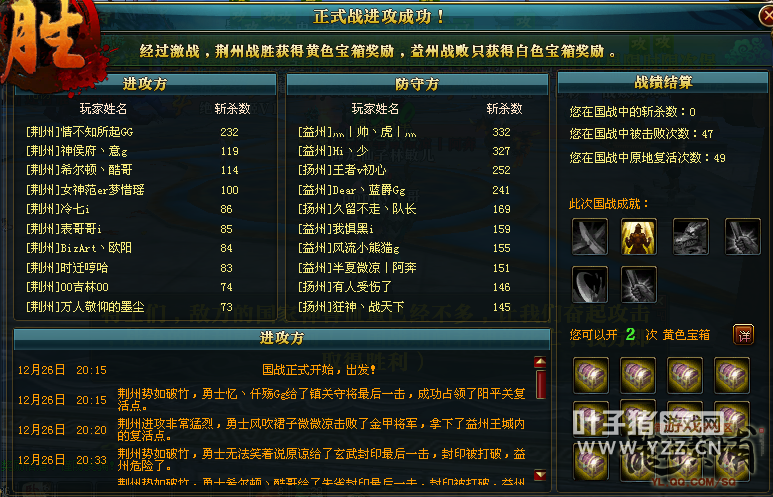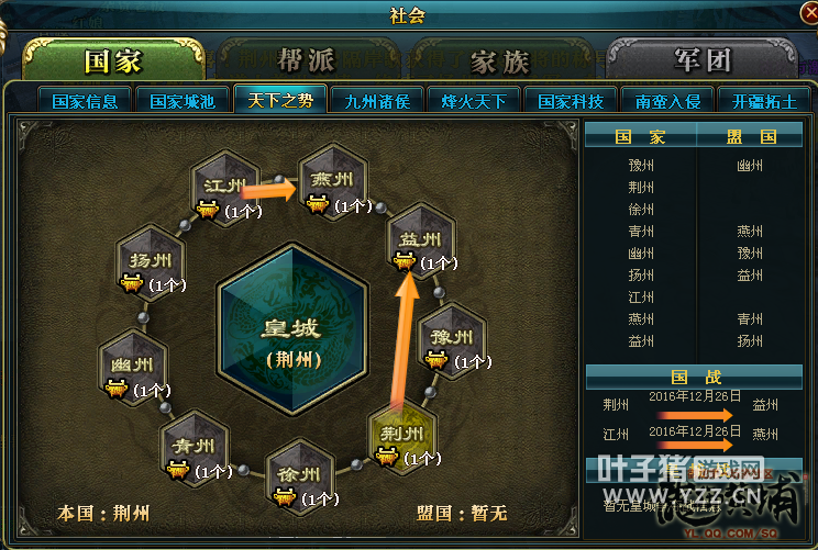 12月26日晚8点15分,国战正式开始。荆州便以极快的速度,接连爆掉阳平关镇关守将,以及益州王城处金甲将军。紧接着两方指挥开始命令国民领取战车,荆州指挥先命令战车在国王雕像处集结,在这里与敌方战车相遇,荆州指挥命令战车开始攻击益州战车,以阻止敌方战车前进。随后荆州指挥率领大批战车进入内城,向青龙展开攻势,益州很快察觉到荆州意图,立即率领战车紧随其后,将荆州战车一一歼灭,使荆州没能顺利爆掉青龙。荆州指挥命令国民继续领取战车,在青龙与白虎之间来回奔走输出,让益州、扬州两国在两地疲于奔波的同时,还安排了小股部队对朱雀玄武进行攻击。很快,荆州占领了朱雀玄武,中间神兽被激活,荆州开始输出,但益州很快夺回朱雀,神兽进入无敌状态。之后荆州指挥在经过几番攻击后,拿下了青龙白虎,中间神兽再次被激活,荆州开始疯狂输出中间神兽,神兽掉血很快。益州、扬州虽然立即夺回了玄武,并且努力想要夺回青龙白虎,但还是心有余而力不足,在战斗结束时也没能夺回,荆州顺利爆掉神兽,国战结束,荆州胜。