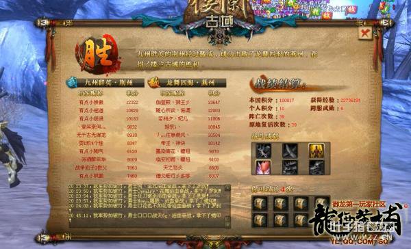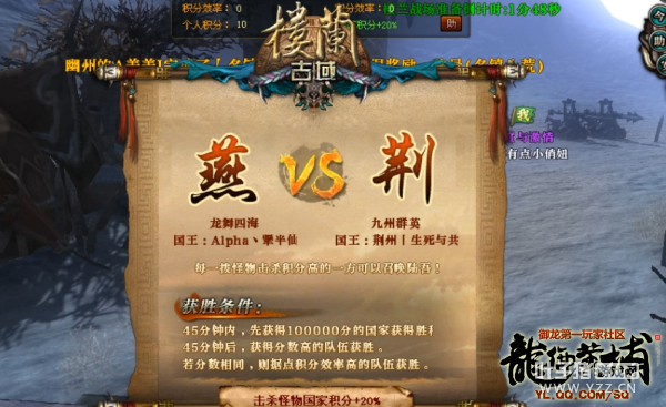 历时三个月的第一国战联赛在12月30日正式结束,当天晚上的跨服楼兰争霸赛也成为了这次赛事最后的杀戮盛宴,除了第一的【龙啸九州】豫州遥遥领先外,其余前三的种子选手分差都不大,这最后一场的胜负关系到最终的排名,各国都十分重视。今天我们关注的是【九州群英】荆州的最后一场比赛,对手是来自【龙舞四海】的燕州,两国楼兰遗迹占有度都是155,这场比赛,败者出局,胜者才有希望跻身前三。