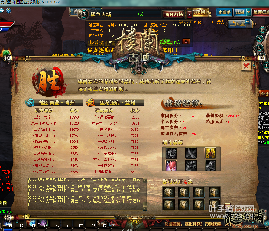 12月28日,跨服楼兰争霸赛进入倒计时,每个参战人的内心充满了期待和激动,他们摩拳擦掌,准备做最后的冲刺,迎接辉煌的时刻。今天依卡和大家一起全程观战的是【雄图霸业】青州对战【猛龙逐鹿】益州的楼兰战。