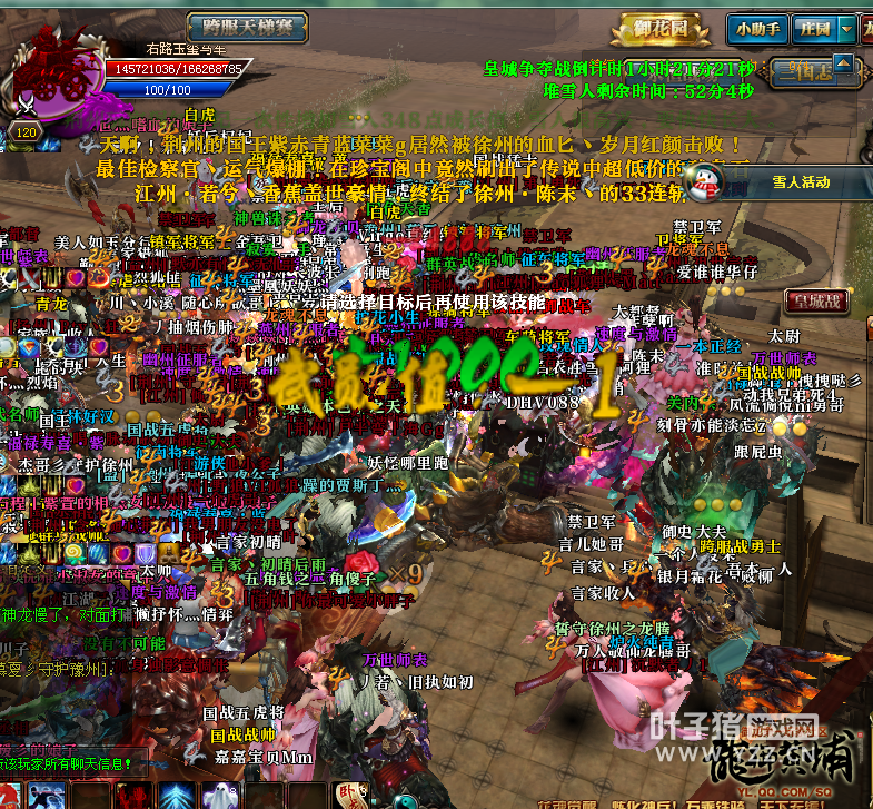 马车出现时徐州把玉玺放在了左路的车上,安排了两个强力家族保护,并命令其他的战士重点砍杀中路输出马车的红名战士,转移敌人的注意力。徐州的作战方案是很明智的,毕竟他们被三个强大的国家堵截,要合理安排好战斗力。当敌对国家击爆中路马车后发现不对,马上转移到左路马车的时候,徐州已经很接近目的地了,但这场战争的敌方有三个国家,参战人数实在很多,战斗力也很强大,玉玺马车在距离接送官只有几米的地方被敌方击爆,神龙重新出现,徐州又要重新开始一轮战斗,实在可惜。