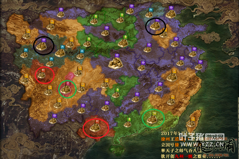 第四步:灭青州(未完成) 徐州在反王荆州之后,荆州被完全控制,荆州当前仅剩一座王城和一座小城,灭国已势在必行。徐州打算在灭国荆州的同时,调集家族和高战,准备反王青州,然后像控制荆豫一样控制青州,再把青州灭国,把青州这一根毒刺彻底拔掉,然后迫使青州玩家转入江州,集中打压江州,再进一步灭掉江州。 第五步:灭江州(未完成) 因为幽州、益州、扬州,都是徐州忠实的附属国,并且益州和扬州城池已经只剩下王城,幽州城池也不多,所以徐州可以分分钟灭掉幽益扬,唯独江州城池最多,高达十二座,所以想要灭掉江州绝非易事,当然,如果徐州真的灭了江州,可能真的就完成了真正的九州一统。