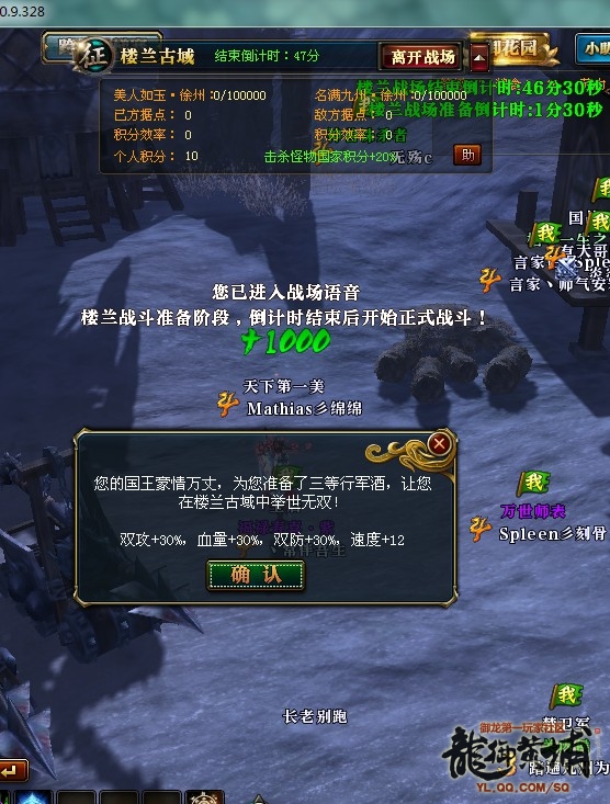 【美人如玉】才进入130级封印,徐州虽然拥有2套15星战将了,可是国力其实才是普通国,但是一直以来这个国家的战斗气势永远处于最旺盛,很多原因来源于有一个楼兰战役很多丰富经验的指挥官:“Mathias彡小伟”,他充满激情的指挥方式也让国民十分热情,带动起战士们的勇气,而且会做很具体的分析与迎战战略。还有一位爱国的国王“Mathias彡AoJie”,很多次国王都会慷慨大方的购买楼兰行军酒,给予勇士们的最好状态,可以痛快淋漓的发挥。 今天晚上也是如此,【美人如玉】徐州在进入楼兰战场之前就做好了充分的准备,果然在战场上又一次遇见老对手【名满九州】徐州,两国已经交锋多次,【名满九州】徐州的级别已经在150级封印了,而且高战也很多,多次的对战也很熟悉彼此的战斗攻略,尤其是今天晚上的楼兰战役是这一期最后一站,双徐国也处于同样楼兰遗迹占有度165,所以,为了最高荣誉,必定是非常惨烈的交战。