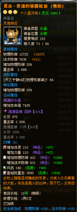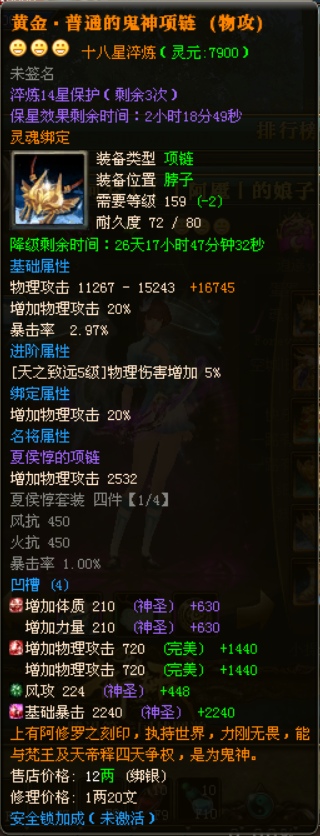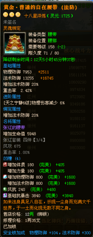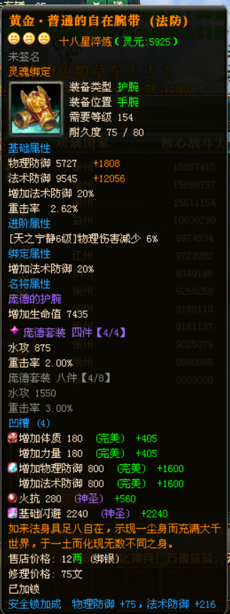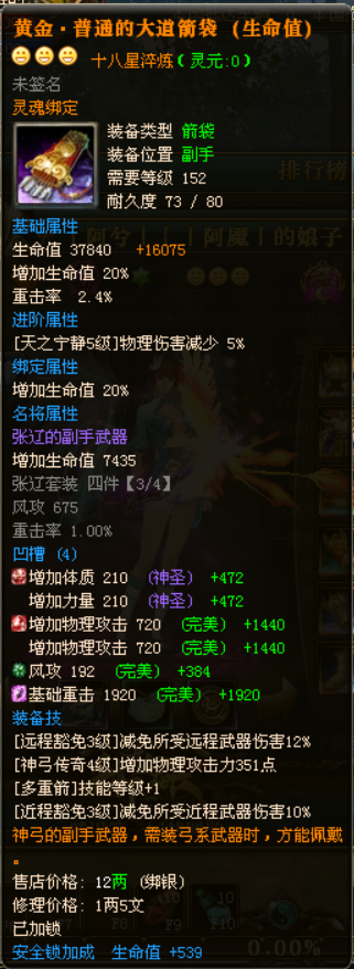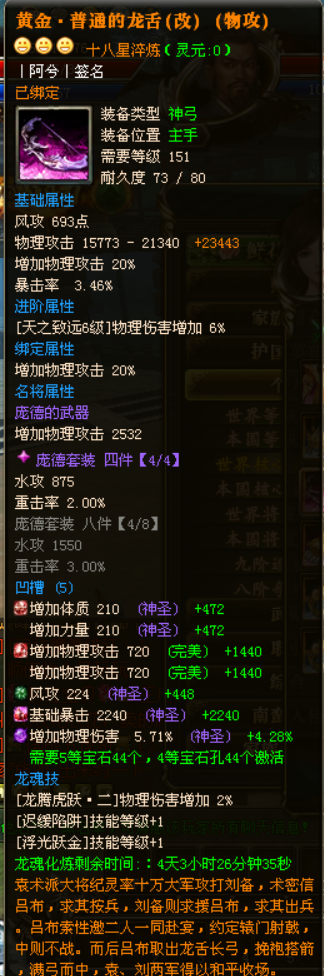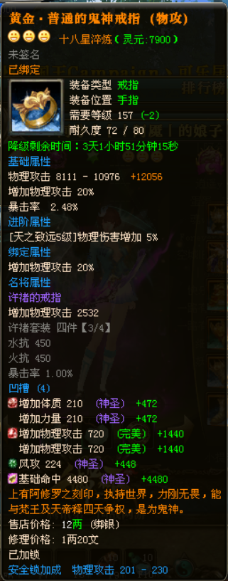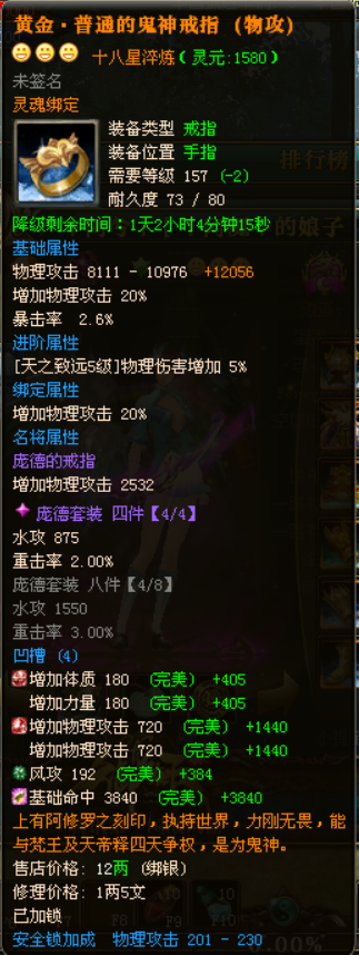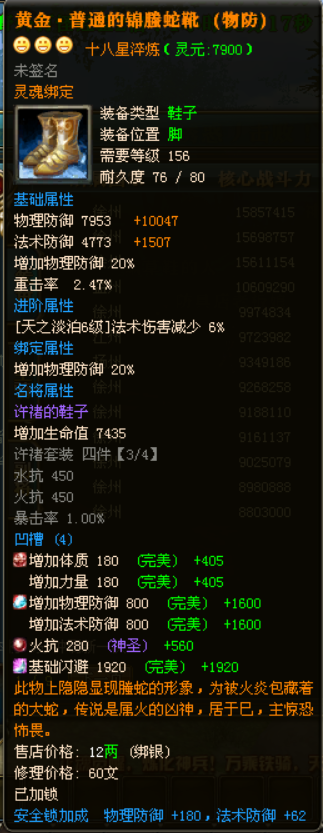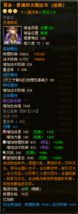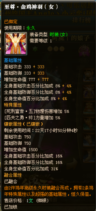 倾城王朝作为白虎战区的一个略显低迷的区服,其区内并没有什么大事件而让御龙族们侧目,但这并不能证明倾城王朝内没有激情没有大神。在倾城王朝刚破150封印的这段时间,区内玩家在忙着冲级的同时大部分已经开始着手准备提升战力,又恰逢消费活动的来临,这就让本来某些犹豫不决的玩家动摇了决心,趁着此番消费榜的活动开始向更高峰进发,其中徐州的丨阿兮丨就在默默升级换装备的过程中开启了十八星天尊之路。 而说起这位冲刺十八星天尊的大神玩家丨阿兮丨,倾城王朝的小伙伴们定然不会陌生,其一直很注重自己的游戏属性,在150封印的时候就已经是一位强力的15星位居世界战力榜前三之内,更与区内屈指可数的十八星天尊丨阿魔丨结为了游戏情侣,说是区内风云玩家也不为过。而此番丨阿兮丨在进军18星天尊的道路上也并没有遭受多大的坎坷,虽然由于等级的原因只是时间略微长了一些,但总算圆满砸上最后一件18星的装备,成为了区内第三位十八星天尊,在刚成为十八星天尊后便直接跃居世界战力第一,可见此号的底子之棒。小编也相信此十八星帐号在丨阿兮丨的手里将会越来越强力。 区服:倾城王朝 角色名:丨阿兮丨 装备简介:人物橙色黄金18星,副将黄金15星,橙色马庄14星,紫色八卦8级16件套,六等石头混搭绿色宝石孔,极品紫15星披风 了解更多相关信息,请前往http://ylzt.yzz.cn/ [编辑:叶子猪猪少先队大队长]