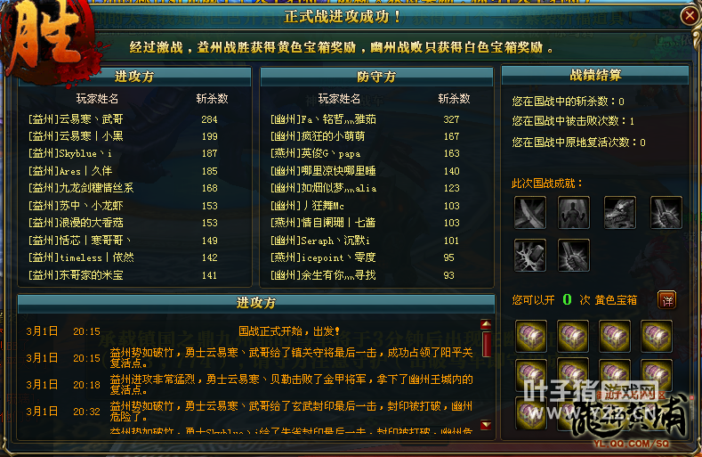 益州进攻幽州国战 国战开始以后,益州进攻算是很顺利,成功的拿下镇关守将与幽州王城金甲将军,益州国民安全进入金甲将军复活点,益州指挥让国民们休整一番,等待下一步指令。 等待一会以后,益州指挥让国民们领取战车,想要攻向幽州大鼎位置,不过益州战车并不多,被幽州战车堵截在国王雕像,并且迟迟不能消灭幽州战车。