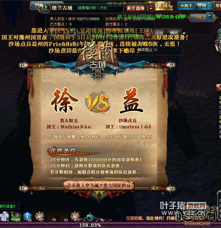 与【美人如玉】徐州对战的是来自【沙场点兵】的帝国益州。益州是一个很强大的国家,目前徐州只是130级封印,而益州已经是140级封印了。虽然徐州有着楼兰二等行军酒的优势,可是益州级别上的优势对他们来说是很大的压力,让我们一起围观这场激烈的战斗。 战争的号角一吹响,徐州就按照自己的计划首冲中间据点,然后安排国王家族与另外一个强大的家族直压12点方向据点,争取在第一时间抢夺成功。而益州则在第一时间集中火力输出6点方向的据点,然后才分散到各个家族被安排到的据点。 这次的楼兰系统设置是各自有3W的基础积分,然后通过抢夺据点给予积分提升,同时击杀红名玩家也会得到积分,被击杀的国家则会因为玩家的伤亡被扣去积分。
