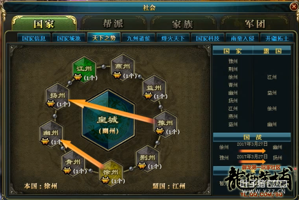 3月27日,【人面桃花】徐州对幽州发起国战,徐州的盟国江州和幽州的盟国益州也参与了本次战斗,晚8点10分,双方指挥都上麦进行战前部署,守方幽州的盟国益州直接下边幽州,大部队围拢圆盘严阵以待,而攻方大批国民也迅速集结本国圆盘,找好队伍加好BUFF,等待国战的开始。