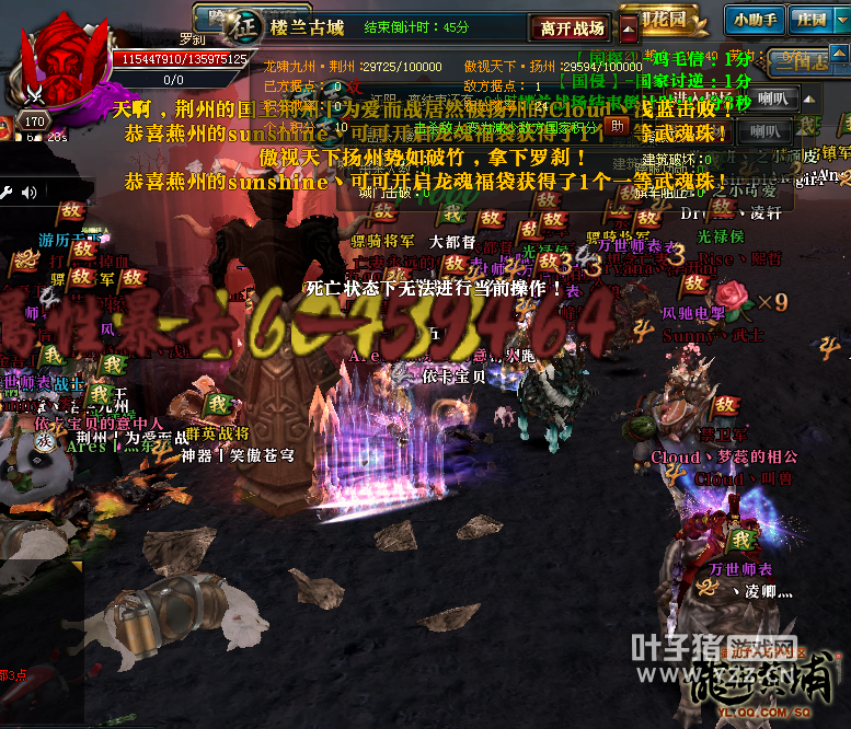 今天,在楼兰战场上相遇对战的是【龙啸九州】荆州和【傲世天下】扬州 ,同是来自双线一区青龙战区的两国,在级别上是基本上都已进入160级别封印,对于楼兰战役老区的战士们已经是身经百战了。只因为两国分别是各自服务器中的弱国,国力上并没有太大差距,不过荆州拥有5套15星战将,然而扬州却只有一套,所以在实力差距不大的情况下我们一起期待看到激情的对战。 如今的楼兰战役比分有两种设置,一种是双方各自拥有基础积分3W,然后通过抢夺占有据点和击杀红名战士获取积分,哪个国家积分最先达到10W就获得胜利。另外一种设置就是积分从0开始打到10W,同样是先达到10W的就是胜利方。总而言之,楼兰战需要比拼的就是如何依靠抢夺据点获得积分,所以在据点的抢夺上、楼兰怪物和楼兰女王的击杀是最重要的比拼。