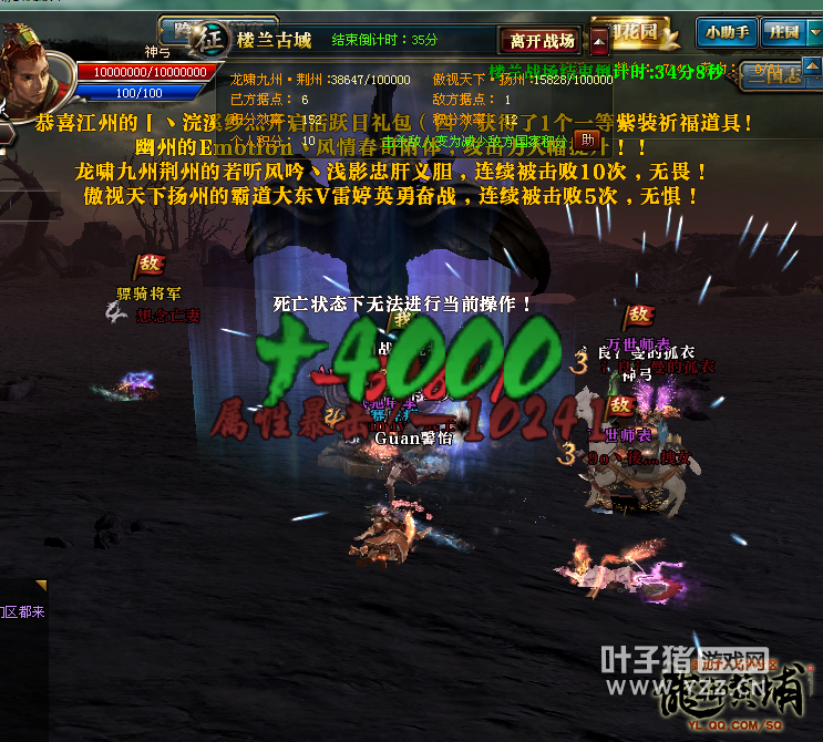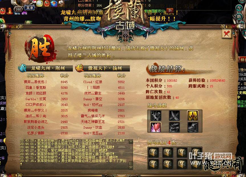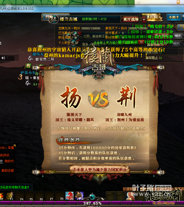 最关键的时候到了,楼兰怪物要刷新了,对于双方来说这是非常重要的,若是成功抢先击杀楼兰怪物,就会让积分大幅度提升,所以双方在战场四周安排了战士们寻找怪物。俗话常说人多力量大,荆州战士们第一时间找到了楼兰怪物并强力输出,击杀了全部的怪物。因为一波怪物可以给大量积分,所以荆州成功地把拉开了积分的差距。面对如此的战况,荆州战士们更是越战越勇,气势如虹,强势在各个据点上展开激烈的输出,很快就成功占有了7个据点,并安排了众多高战来到12点顶层,强势击杀楼兰女王,同时,直杀到扬州的复活点堵截扬州出战的战士,一点机会都不给扬州留下。最终,荆州以大比分吊打扬州,楼兰战获得胜利。