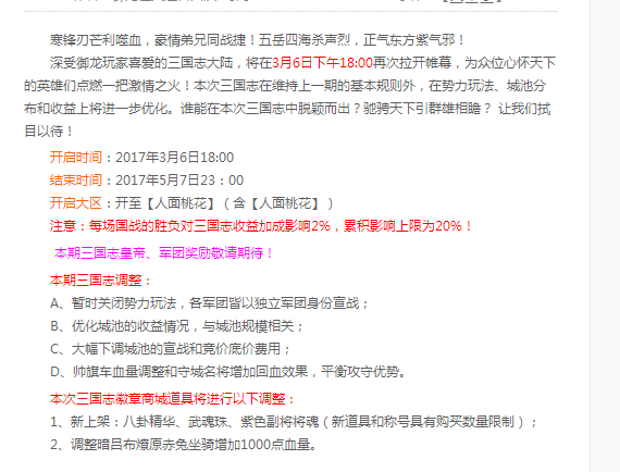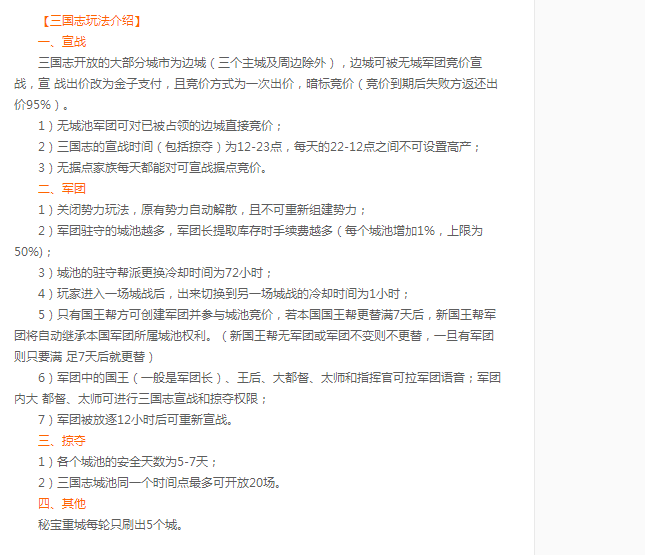 三国志,一直都是各个国王赚钱的重点!可以说,有很多国王都通过了三国志赚了很多的金子和银子,一天轻轻松松玩游戏上千可以说这就是三国志!自己不用费什么太大的力气,靠着国民的力量就可以挣很多钱!让小编来逐步分析一下这些规则! 国战胜负,影响三国志收成,国战胜利增加2%,失败减少2%,一共到20%。也就是说,如果,你是一个月挣了1000D,你输一场就亏了20D,挣得越多亏得越多,当然如果是赢了,也就赢得多! 关闭势力玩法,独立军团作战。也就是说都是单枪匹马,拿到皇帝的概率几乎都不可能了! 大幅度下调城池的宣战和竞价。可以说这一条是很重要的因为以前竞价宣城要20块钱甚至是200块钱一次,现在只要五块钱,五块钱买不了吃亏买不了上当,没有人会在乎这五块钱何况是各国国王,所以,由于价格低的三国志,宣城变得随意起来! 帅旗车和名将的回血,这一点更新其实没有太大的用处,因为回血的再快,该推还是能推下来,问题是,这一次出现了一个bug就是帅旗车可以用连点器卡过图,无敌状态,这样就给攻城方造成了极大地便利,毕竟只要插好了帅旗车,boss怎么磨都是可以磨死的!不过好在这个重大bug已经修复了! 无城池军团可以直接宣战边城!这点很关键,因为过于低的宣城,可以直接随便落地,这会让很多已经扎根的国家很困扰,必须每天都卡好城池才能安心! 最后一点小编认为很重要的是掠夺的问题!因为掠夺是可以随便掠夺的。只有在占城五天之后才可以开始掠夺,而如果成功被掠夺,则是要三天没有收益还会被掠夺走一大半的财产!所以很多开高产的城池要注意了!特别是城池被破坏了随便一休都要几百D!建议各位国王还是好好保护好自己的城池! 三国志为期两个月,胜者为王败者为寇,让我们期待最后的胜利归属吧! 了解更多相关信息,请前往http://ylzt.yzz.cn/ [编辑:叶子猪猪少先队大队长]