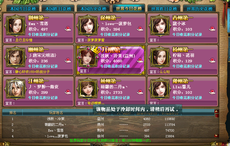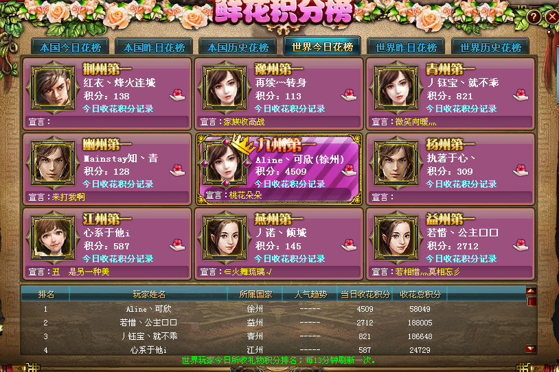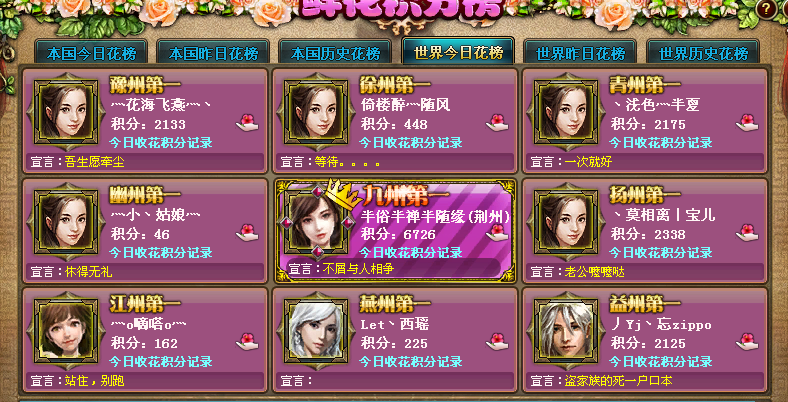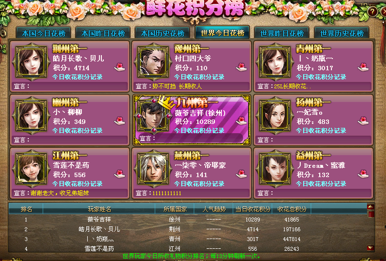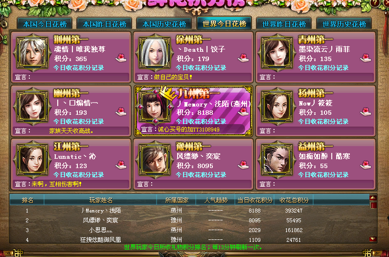 愚人节花榜就跟愚人节一样充满了趣味性。他和之前的花榜不一样,他是一天的花榜,在这一天以内,谁拿到了第一名谁就能得到奖励。但是它的好处是,他给的奖励是实质性的,和之前会跳舞的时装不一样,他的名额有限,只有九个名额,所以给的奖励是永久时装。有分为218的战铠和666的神铠。世界第一的是神铠,其他国家的佳人收到的是218的战铠。可以说这个奖励是比较实际的。因为对于喜欢打架的人来说,得到一个能够提升战力的战铠比得到一个只能穿一个月就消失的舞蹈时装实际得多。而且花榜是女人的最爱而拿到花榜,有很多时候都是她的男人来花这个钱,这个时候花榜的名号可以给她,而花榜的奖励可以给她的对象一举两得。而这一次愚人节的花榜双线一区第一名是桃园风云,一共有10289朵,第二名是龙啸九州,第三名是九州皇图。而王者和龙吟这两个相对于比较年轻的区,都是在4000朵左右。可以说老区还是比较有底蕴的,这合没合区还是有区别的,很期待一区再一次的合区,在一起引发激情! 龙啸九州 桃园风云 九州皇图 傲视天下 龙舞四海 了解更多相关信息,请前往http://ylzt.yzz.cn/ [编辑:叶子猪猪少先队大队长]