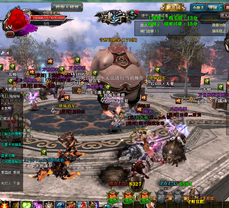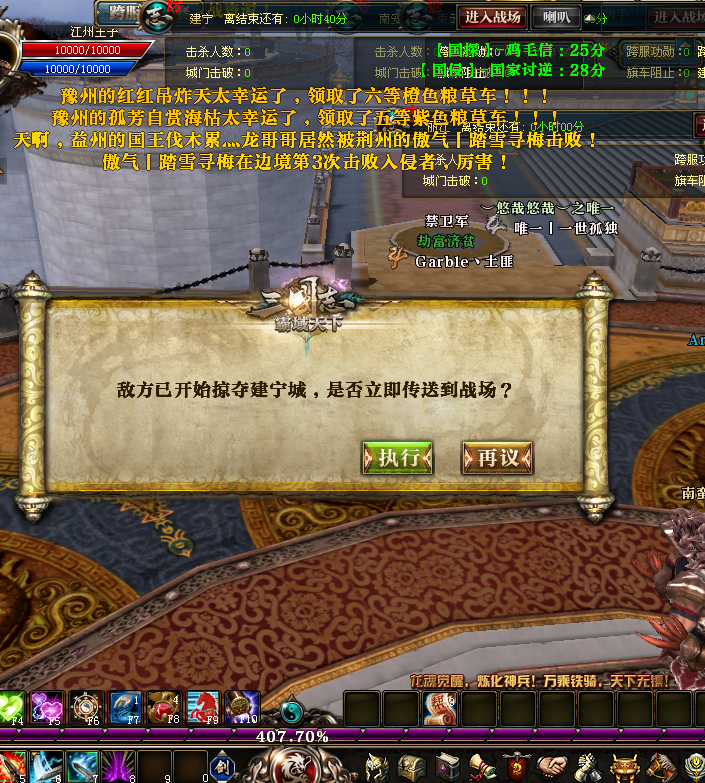 双线一区青龙战区【龙啸九州】是御龙在天历史最悠久的服务器,各国之间的也经历几年的战斗风雨,通过战斗国家与国家之间的关系有深厚的铁盟也有死磕到底的仇敌,他们经常上演为了国家的尊严与荣誉而战的激情大片,今天香馨与朋友们分享的是一场激情的三国志战役。 2017年4月9日晚上,【龙啸九州】益州国“我也不知道取啥 懵逼”军团强势发动抢夺,荆州国军团“装逼遭雷劈”占有的建宁三国城池,两个在【龙啸九州】就是死敌,天天会在不同的大大小小战役激战,是最典型的仇深似海的死敌国家,今天晚上的三国战也是益州专门寻找机会发动宣战,就是为了把双方的仇恨通过不同的战斗释放出来,打击对手,快乐游戏! 益州国国力虽然才是230W属于弱国,可是个人战斗力很强大,国王就是一名18星大神,然而荆州也是弱国,这个国家国力不但不如益州,也没有18星大神,不过这个国家是有血性的,无论对手多么强大也不会轻易言败。 作为防守方的荆州进入建宁三国战场之后,马上就来的城中心,远攻在南门城楼近攻在门口下面随时等待击杀红名敌人。同时,在参战人数明显有优势的“我也不知道取啥 懵逼”军团也速度杀到南门,开始猛烈的进攻,进攻节奏非常迅猛,这个时候“装逼遭雷劈”统帅发出迎战指令,要求荆州全国战士无视红名,首要任务就是不惜代价击杀帅旗车子,堵截敌对,尽量拖延战斗时间,第南门被攻破之后,四辆帅旗分别冲杀到城中心,黑压压的益州战士也兵分几路展开不同的进攻,有去击杀建筑物的,有保护帅旗车子拼命屠杀荆州玩家的,战场四周刀光血影,血流成河。 荆州也非常的勇敢,顶住刀枪奋力输出帅旗大旗,成功的把前四个车子击爆,虽然伤亡惨重可是暂时让益州进攻缓慢。 可是御龙的战场总是以战斗力决定一切,残酷与血腥的,第二轮的帅旗车子又开始进攻,这次护送的战士们更加多,荆州防不胜防,输出力量明显不足,结果有三个帅旗车子非常顺利到达目的地,然后开始攻打BOSS,势不可挡啊,荆州纵使拼尽全力也无法阻挡益州势如破竹的进攻节奏,最终疼失建宁,益州血洗宿敌大恨! [编辑:叶子猪小秘书]