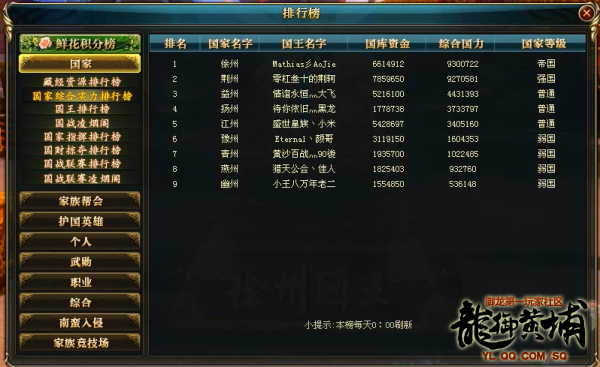 荆州国力位居第二,合服前的荆州并不起眼,但此次九州合纵荆州却抓住契机,强势崛起,国力暴涨至927万,成为新服唯一一个国力上能与徐州抗衡的国家,不过打开世界核心战力榜可以看到,高战几乎被徐州和江州尽数囊括,荆州在顶尖战力上难以与帝国徐州抗衡,也就导致荆州虽有不逊于徐州的超高国力,整体实力比起徐州仍是弱了一筹。 益州目前以440万的国力排名第三,在其他服这个国力已经相当不低了,但是在该服徐州和荆州的衬托下,益州国力显得毫不起眼,加上国内没有能镇住场面的高战,限制着益州的发展,如今的益州可谓空有不低的国力,却没有与之匹配的实力,不过谁也不能保证,益州就不能崛起,毕竟原【煮酒英雄】益州也是从弱国一步步崛起登临巅峰。 扬州国力在370万左右,位居国力榜第四,合服前的扬州默默无闻,本次合服后,扬州国力得到不错的提升。整体实力上看,扬州虽然国力弱于益州,不过国内却有两位不错的高战坐镇,整体实力上和益州旗鼓相当。如此实力与国力,按理说足以自保,但是在合服第一场国战中,扬州面临霸主徐州的征伐,仅仅七分钟便输掉国战,大鼎也被夺走,可谓乐极生悲啊! 江州为普国,以340万左右的国力位居第五,由原【美人如玉】江州王帮入主新服江州王城,在【美人如玉】服务器中,江州和徐州为死敌,虽说后期被压制,但整体实力却并未落下多少,本次合服后,徐州实力得到飞跃般的提升,但是江州却几乎是原地不动,并没有多大起色。瘦死的骆驼比马大,虽然江州国力位居第五,但是国内顶尖高战数量却是仅次于徐州,加上国民在长期战斗中磨练出的执行力与凝聚力,让江州整体实力依旧不俗。