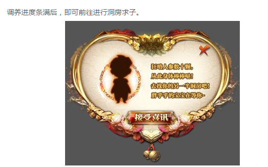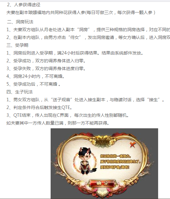 不知道多久以前,从出了结婚系统以后,大家就一直期盼着生子系统的诞生。因为大家都知道,游戏和现实一样,结婚生子,就是这个游戏的流程。果然,在订婚系统,结婚系统之后,生子系统也震撼来袭,而且一个人还可以养两个孩子。但是最大的重点是,不管你已婚未婚你都可以生孩子!也就是说,你可以自攻自受,雌雄同体了哦! 在已婚玩家这里,生子第一步就是备孕!但是和现实备孕吃叶酸不同我们这备孕可是吃人参哦!备孕要吃够人参,吃满了100个人参,才可以进行下一步,这告诉我们生孩子是要按照顺序来的,不备孕是生不出可爱的而又健康的小宝宝的! 下一步肯定就是吃十颗人参,大补之后怀孕!但是怀孕不是百分之一百的,还有一定的概率。如果是普通的洞房虽然不花钱,但是只有30%的成功率,高级套房花8000金子,成功率50%,豪华套房花20000金子,成功率90%。 生孩子不是白生的,生了孩子孩子的长相是随机的,而且结了婚根据公告是不可以离婚的哦,但是究竟到底如何让我们期待一下吧! 了解更多相关信息,请前往http://ylzt.yzz.cn/ [编辑:叶子猪小秘书]