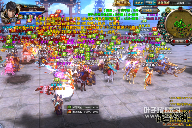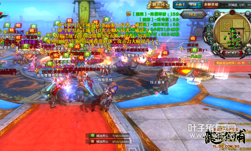 江州、豫州逐步发力,领跑城池民心值 荆州进入城池战场以后,看到江州、豫州两国国民,人数很多,放眼看去,红名要远远多于本国玩家。两方厮杀在一起,荆州开始还能不让城池民心拉下太多,不过时间一点点的过去,江州、豫州两国逐步发力,占领得分点时间越来越长,城池民心增加很多,使得江州、豫州一方始终领跑,荆州被动追赶中。
