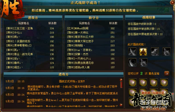 攻方指挥下令国民领取战车开往王城郡守,将沿途的守方战车一一点杀,守方指挥见攻方战车王城郡守集结迟迟不动,直接率领战车从大鼎杀向王城郡守,攻方指挥命令战车从右侧楼梯压上过图口,在守方战车尾随击杀下,成功过图进入内城的攻方战车所剩无几,刚赶到白虎便被留守白虎的守方战车尽数歼灭,第一波战车攻势胎死腹中。此时朱雀和玄武在小股骑兵输出下已经是残血状态,攻方指挥命令战车被爆的国民压向中间神兽,一波两点齐爆激活神兽,带走神兽约十分之一的血量。 攻方指挥命令国民再次领车开往大鼎,在守方战车到达之前将大鼎一举攻占,短暂的集结后,攻方战车直接右侧过图杀向白虎,守方战车一路尾随支援白虎,双方一番战车火拼后,带走白虎约四分之一的血量。随后攻方采取部分骑兵争夺朱雀和玄武,不断激活神兽,以此对神兽进行磨血和牵制守方国民,大部队则领车开往大鼎,不过,有了之前的经验,守方指挥派遣不少战车驻守大鼎,攻方数次战车攻势都被守方轻松化解,攻方战车始终无法突破防线,被守方拦截在内城之外。 攻方指挥见数次战车都无法取得预期效果,只得下令国民骑兵模式进入内城,对朱雀和玄武发起猛烈攻势,通过不断激活神兽来磨血,虽说守方数次控血失误,让攻方有两点齐爆的机会,但在守方瞬移迅速抢夺下,攻方无法对神兽造成过多伤害,直至战斗结束,攻方也无法将神兽爆掉,最终,豫州获得本场国战的胜利!