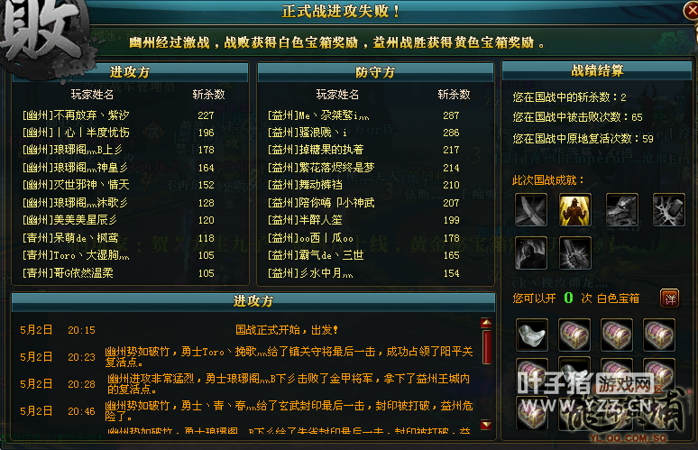 5月2日晚上8点15分,国战正式开始,青州和幽州大军在幽州御用指挥熊猫的带领之下下边益州,益州直接在边境拉令围追堵截。青幽大军顶着边境和阳平关的压力达到镇关守将,爆掉镇关守将,再安全爆掉金甲将军。领取战车,开始绕道国王雕像压向大鼎。益州在内城拉令集结,领取好战车,随时待命。很快,青幽大军的战车在大鼎集结完毕,在指挥的一声令下从右边进入,佯攻白虎。在进入后,益州战车大批量压向白虎,幽州指挥突然令幽州战车后队变前队,出大鼎右侧出口,从大鼎中间入口进入直逼无人防守的青龙,一波打掉青龙近半血,大获全胜,国战胜利希望很大。青幽继续领取战车,在青龙和白虎之间套路迂回,与此同时内城朱雀和玄武相继残血,即将被爆,青幽战车在进入内城被爆之后,压向中间,本以为会输出中间神兽,但幽州指挥却令所有玩家参战再领战车,目的似乎是想要报白虎或者青龙爆掉一个,再打中间神兽。但未曾想就在青幽大军战车再集结的时候,朱雀却被益州007爆掉,青幽指挥大为震惊,仓促进入内城准备输出中间神兽,因为益州高战远多于青幽,中间神兽仅仅被打掉4%就石化无敌。至此朱雀和玄武被益州高战和007牢牢控制,加上此时盟国频道不时出现007蛊惑放弃国战等等消极言论,青幽士气大损,砍王城大旗又遭遇益州强堵,战车数量急剧减少,青幽无奈放弃国战。