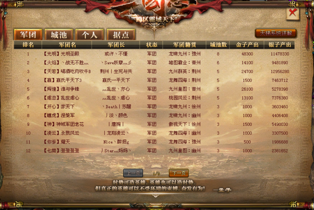 说起三国志玩法,每一位玩家定不会陌生,因为大家都知道三国志大陆上每一座城池都代表着十分可观的收益,虽然说是大部分收益都属于军团长,但是军团成员每天也可以获取一定的福利,所以不管是以何想法为出发点,每一个军团长都想在三国志战场上占据一城半池,所以造成了三国志大陆上遍地战火的混乱局面。 但后来当御龙在天内三位出手十分阔绰的神豪达成协议后,以三位神豪军团为中心聚其附属军团以及外服盟友散布四周形成了既能合理的保障了附属军团的收益又能对敌对军团形成火力覆盖的防御带。在此精密的策划之下,三国志的格局保持了很长时间的三分天下格局。但随着三位神豪的相继隐退,之前被他们拒之门外甚至在三国志大陆无法立足的军团们却是锋芒毕露,更是在此期三国志中属中梁砥柱之流。让我们一起看看究竟是哪些军团吧! 光明圣殿军团: 自三国中开启,实力强劲的老牌军团,在最初三国志中因属”三巨头“中某位敌对军团的势力,即便在盟友退服之后丝毫不服软,一度被当时的“三巨头”以及盟友列为头号大敌,但虽光明军团实力亦属顶尖之流,但双拳难敌四手往往落地不久就被流放,数期三国志难有所作为。当三巨头不再引导三国志战局后,该军团重整雄风,在本期三国志占据领头羊的重要地位,隐隐有取代三巨头的趋势。 赢式平天下3军团 错不逢时,与三巨头之中的一位同属一区却互为死敌,在区内打的绘声绘色,在区外却是形单影只。在之前数期的三国志中,根本没有赢式军团的什么事,一直被犹如战争机器的三巨头集团拒于三国志大陆之外。但是在此期三国中却是占据了数量不少的城池,如今也是坐等收官。 龍魂丶義戦军团 同样与三巨头中的一位有着很深的过节,说是不死不休也不为过。军团实力虽不能与光明军团相比,但其军团内超过十位之数的的高战玩家再加上不少的普通玩家,每一次的落地都让当时的策划头疼不已,弱军团打不动强军团调不开。但即便让策划十分头痛但也被拒于三巨头阵营战线之外。 哇塞军团 登登登登军团 不属同区却有同遭遇,每期三国志坐看敌对军团坐享收益的他们,实力无法比之光明与龙魂军团,无奈之下当起了土匪。而且在当时联系了数个军团,旗号效仿电影让子弹飞起来中的麻匪,能落地就落地不能则每日掠夺,并且专挑重城大城的掠夺,很难想像这帮拆迁户每拆一城,驻守城池的军团长内心是如何的滴血。 但在此期三国志中,两个军团大改麻匪之气,安稳的在内陆做起了土地主,时不时的卡卡城坐享诱人的收益。 [编辑:叶子猪小秘书]