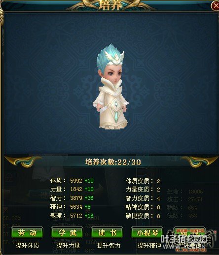 所有的父母都希望自己家的孩子能够成材,那就需要精心的培养了。传人可以通过服用培养丹来进行培养,每服用一次培养丹(北海欺负小孩的无赖、善缘副本、商城产出),可获得一次对传人进行培养的机会,可选择劳动、学武、读书来培养传人的相应属性,同时消耗相应的道具。 需要注意的是,传人的资质将最终影响传人培育的效果。其中力量资质和智力资质到目前为止九歌所见到的最高为4,最低为2,而体质、精神、敏捷则最高为8,最低为2。资质将影响每次培养过程中,传人所获得的属性点和装备加成百分比,例如,传人的体质资质为8,则给传人使用“金砖”进行劳动,能够给传人增加8点属性点,增加0.08%的生命加成。而敏捷资质为2,如果给传人使用“糖果”进行嬉戏,传人将增加2点敏捷,以及0.02%的物防加成。加成的提高,决定了主将能够从传人装备上获得更多的战斗力。试想一下,当某一个加成通过培养被提高至100%时,主号就可以全部继承传人装备的属性,等同于多穿了一件装备,其给力程度可想而知。 但培养丹每天只能通过北海欺负小孩的无赖副本和善缘副本获得,每天产出两个,商城售价880,数量非常有限,如此一来,每一点培养都要精打细算了。由于传人没有防御类装备,将培养次数用在精神和敏捷上,实在有点浪费,体质、力量和智力才是主要培养对象,至于选择血量,还是选择攻击就看个人爱好和职业匹配了。 选择要血量的自不必说,但选择攻击的将士们都非常疑惑,物法双修的情况下,传人究竟是加力量,还是加智力呢?这里与一般的物理攻击加力量,法术攻击加智力的认知是不同的,传人对于主号攻击的加成是不分物理还是法术的,即使传人所附带的攻击是物理的,一样可以对主号的法术攻击加成。那么在这种情况下,九歌个人认为,传人的智力资质和力量资质哪一个高,就培养哪一个。