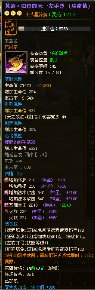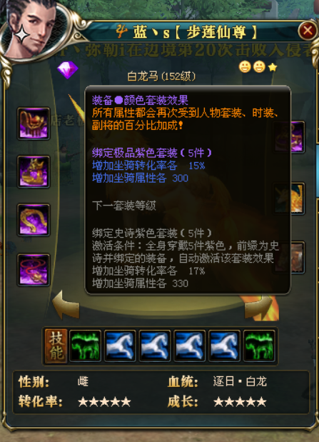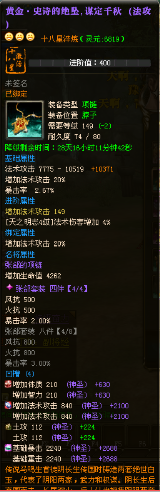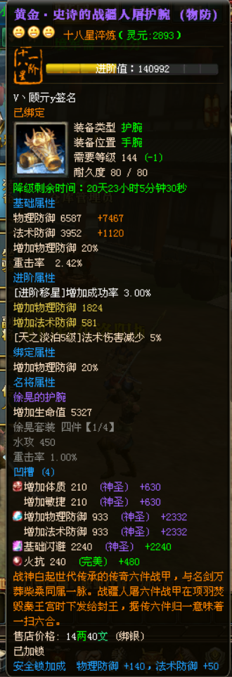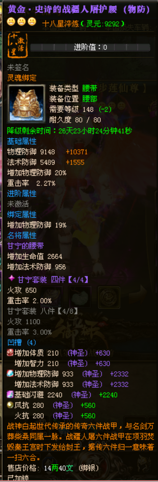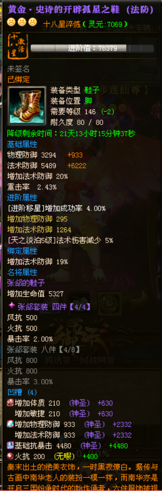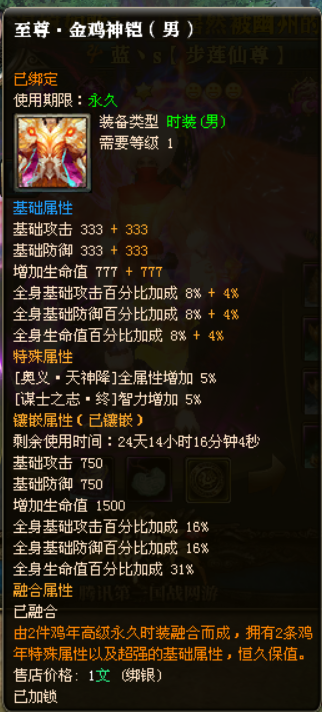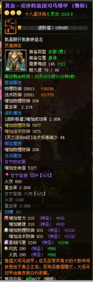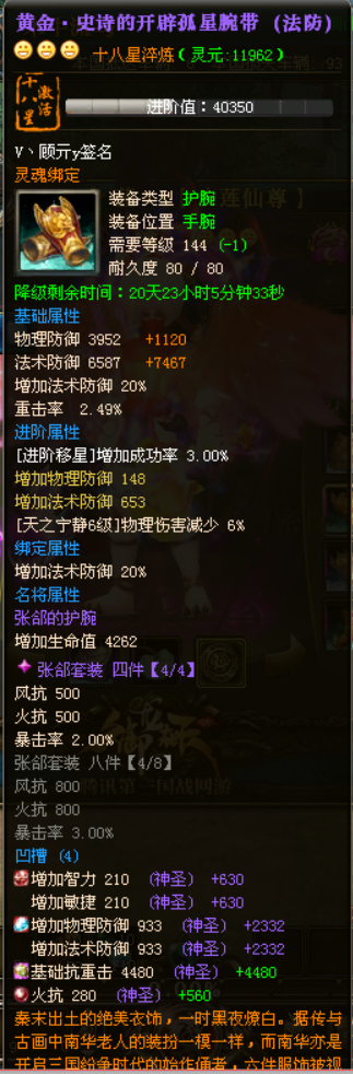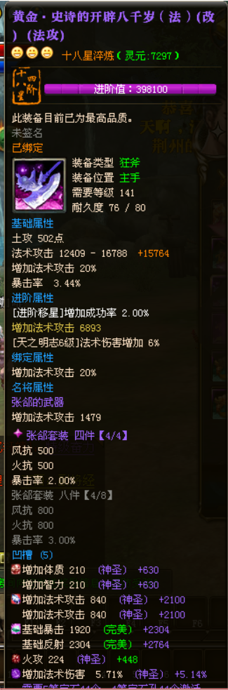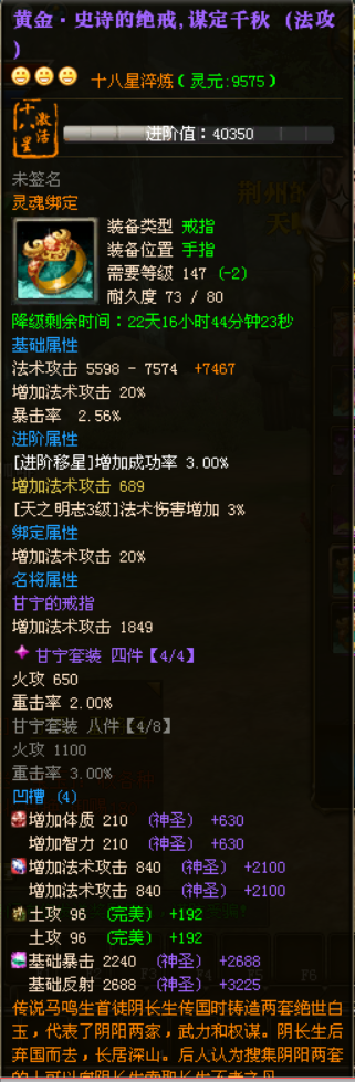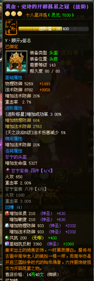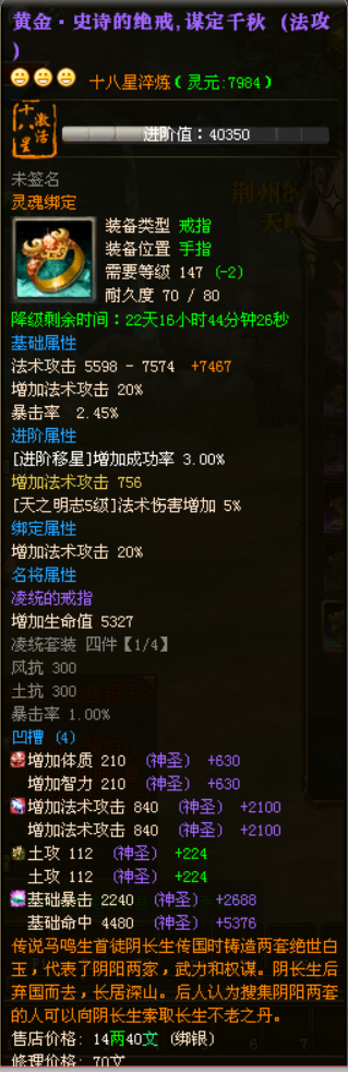 金玉良缘虽然对于御龙著名的一些区服来说还略显稚嫩,但是由于区内玩家的活力还是十足,从而致使此区的激情也是从不缺少。激情的战斗自然而然会让御龙族们注重装备的提升战力的提高,由此也造就了区内为数不多的数套15星战神。 但是近日的消费活动的来袭,却是让他们再次蠢蠢欲动起来,在后面的几天里终于有位大神蓝丶S 按耐不住自身的洪荒之力,开始向十八星天尊冲刺。虽然砸星之路略显坎坷但但是历经一礼拜有余成功砸成了全套十八星装备,但由于此区刚开140封印,也意味着玩家装备从130+装备过渡140+装备的时期,所以该位大神由于等级问题无法穿戴齐140+十八星装备。但在大神的努力以及霸王之魄的帮助下,在几天前在游戏内成功激活了十八星天尊的成就,蓝丶S成为了金玉良缘首套十八星天尊。 区服:金玉良缘 角色名:蓝丶S 装备简介;人物黄金史诗紫18星,副将半套黄金15,差一件史诗黄金马13星,紫色八卦八级16件套,全身多数六等双属性外加紫绿宝石孔,极品紫15星披风 [编辑:叶子猪小秘书]