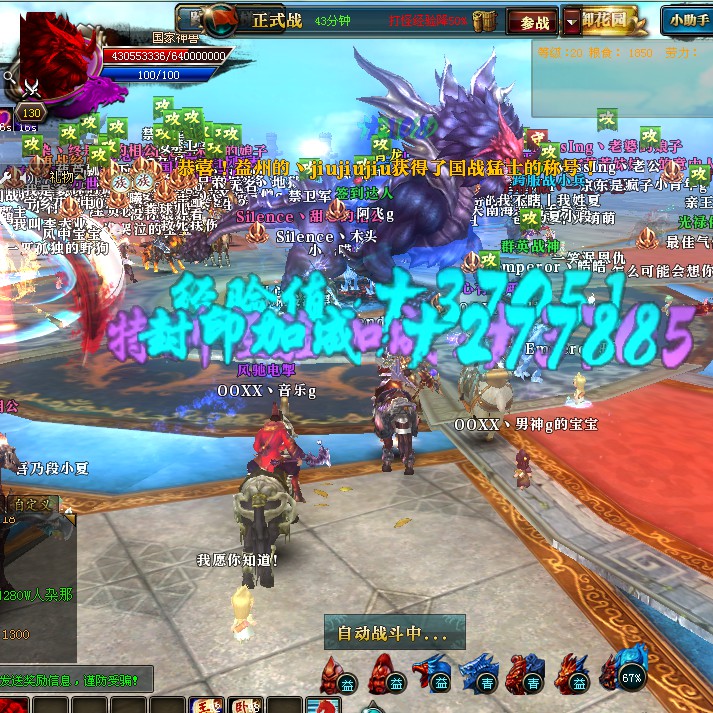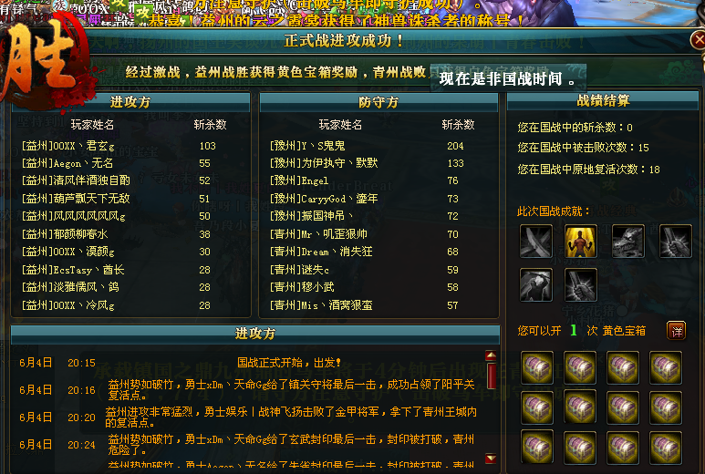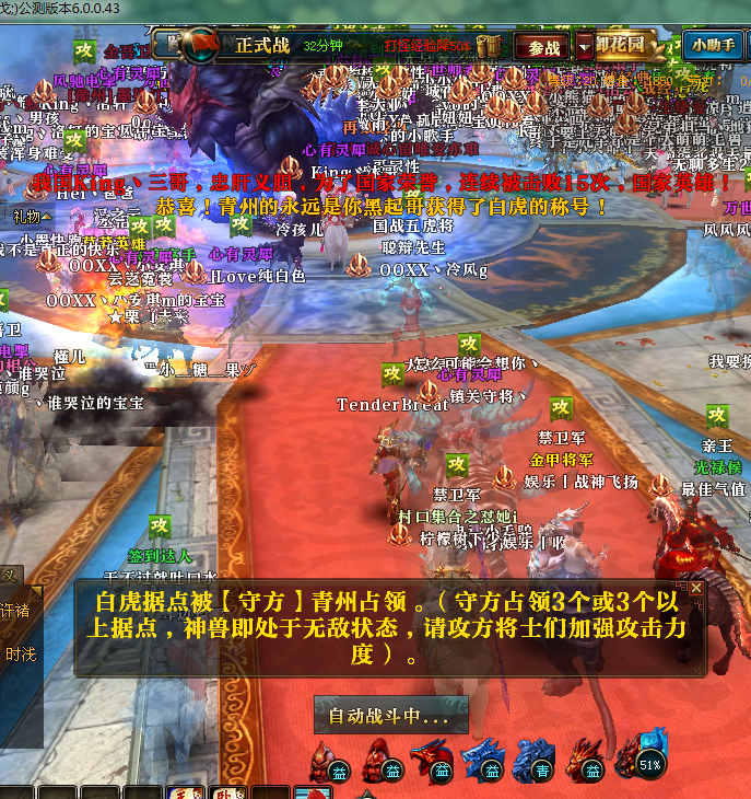 作者 香馨 勇气加团结,还要提前的布战,最大化充分发挥国家的战斗力,激发出战士们的血性,这样就可以在艰难的战役上事成功半。 2017年6月4日周日,经典服务器【铁马金戈】益州非常勇敢发动进攻青州国战拉响,益州没有盟国必须单枪匹马参战,然而青州有盟国豫州,所以这个是1V2的国战,是对于益州的挑战与考验。 益州气势在这个服务器国力并不是很特别强大,是一个普通国,不过这个国家真的非常有血性,多次收获以弱敌强丰硕战果,今天有将会是怎么样呢,让我们拭目以待! 青州与豫州两国合作已久,互相配合很到位,今天晚上也誓死保护国家,拼尽全力,表示要痛打侵略者益州,一场激情的国战开始! 益州在进攻青州阳平关上表现出了猛烈,进攻速度非常迅猛,很快就击杀镇关杀到王城,益州为了给予敌人气势上的压制,第一波就决定全国战斗力进行人物进攻朱雀玄武,果然霸气,但是,防守方青州有着拉令与瞬移的优势很快就把朱雀玄武抢夺回来,阻止了益州击打中间神兽的步伐,第一波益州打到神兽83%血量。 这个时候益州也做出新的指令,要求战士们全部领取国战弩车,用战车模式进攻青州王城内城的白虎青龙,然后安排高战磨杀朱雀玄武,争取四点齐爆。 这个是硬战,因为青州也马上领取战车堵截点杀, 在看见两国的战车展开了交战,益州多次组织方便在大鼎和密道进攻,同时高战人物进攻的牵制,让青州防守很吃力,渐渐的防守步伐跟不上了,最终益州多次双杀战车神兽,成功击杀中间神兽,获得国战胜利! 国战失败之后的青州只能无奈进入受鼎阶段,更为血淋淋的对抗,哪怕伤亡惨重,哪怕无限复活也要保护国家的尊严,勇敢的青州全国战士最终有生命击杀了马车保住了大鼎。 [编辑:叶子猪小秘书]