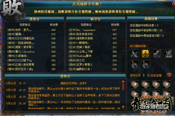 徐州在当天也有一场防守战,两国管理协商后,徐州决定放弃本国防守战,全力相助豫州进攻扬州,8点左右,豫州指挥动员本国国民边境圆盘集结,徐州指挥也带领国民直接下边豫州,与盟国汇合,两国国民最大化集结,与此同时,守方国民也在指挥带领下边境集结,准备堵截来犯之敌。很快,集结完毕的攻方国民下边扬州,守方国民立即迎面而上,全力屠杀攻方国民,攻方指挥下令国民不与之纠缠,直接开赴阳平关,守方指挥则沿途拉令堵截,双方一路厮杀至镇关守将,彼此都有所损失,此时距离国战还有一段时间,攻方指挥为减小国民损失,命令国民躺尸等待国战来临。 8点15分,国战正式开始,攻方国民立即起身输出镇关,在攻方国民集火之下,镇关掉血速度相当快,很快便被攻方成功爆掉,攻方指挥下令国民进入王城,直奔南门而去,守方指挥也命令国民瞬移南门防守,双方围绕南门展开激烈厮杀,南门在攻方国民猛烈炮火下也没能支撑多久便轰然倒地,王城门户大开,攻方铁蹄直奔金甲而去。守方指挥命令高战前往金甲击杀敌军,其余国民则安全区领车送给盟国,这样一来金甲将军处攻方国民压力大减,待金甲保护时间过去后,迅速将金甲击杀,拿下西门复活点。