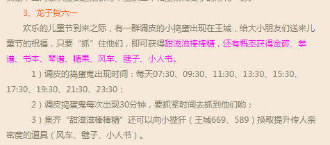 六一儿童节是小朋友们的节日,但是在御龙里也是我们所有御龙人的节日,希望所有人都保持初心来玩御龙。而且全新的活动和之前的万圣节怪物完全不一样哦,以前出现的捣蛋鬼都是每天下午的两点半,三点半,晚上的八点半和九点半这四个点出现。但是这一次的小捣蛋就不一样了。每天早上的七点半,九点半,十一点半,下午一点半,下午三点半,下午五点半,晚上七点半,晚上九点半,晚上十一点半,这几个点出现。给我们送礼物,只要我们在王城采集他们,他们就可以给我们送礼物。 这个只要采集就可以获得礼物其实对于小号来说是有好处的。因为有些人是打不了一个捣蛋鬼的,而必须去组队打,但是组队东西肯定会减少,而且打死了也是要靠手速,有的人打了很久最后所有的东西是别人捡走了,所以很容易因为这个生气,但是这个小捣蛋只要你采集好就好了。采集到了东西一定是你的。而且东西的话,采集每一个小捣蛋的东西都是一样的有魔王变身糖果,有甜滋滋的棒棒糖,明亮的糖果,甜蜜的糖果等等。万圣节魔王的糖果,是用来变身的,只要你吃了他就可以变成南瓜人哦!而甜滋滋的糖果可以去跟小女孩换礼物哦!而明亮的糖果可以在五分钟内增加法术攻击500,还有可以提升法术防御的,暴击的,重击的,还可以不用冷却时间,只要一直吃就可以了!现在打天梯就很需要他哦!而且仔细看,地上的小捣蛋,就是我们身后的小传人哦!然后我们就可以拿甜滋滋的糖果去换。一个甜滋滋的糖果可以换毽子,两个甜滋滋的糖果可以换小人书,三个甜滋滋的糖果可以换风车。我建议如果可以当然是采集三个换风车比较好。因为一个毽子只有5点,一个小人书有20点,而一个风车则有50点。可以说是很划算。而且这些捣蛋一共可以出现半个小时,过点就会消失。所以那些绑银很少的人就可以靠这个来不花一分钱养孩子,毕竟一个孩子其实是很花钱的,一天会降两百以上的亲密度,只有靠着花绑银的毽子,以及花钱买风车小人书才能获得亲密度!所以大家赶紧去王城寻找我们的小捣蛋吧,能收到很多丰厚的礼物哦! [编辑:叶子猪小秘书]