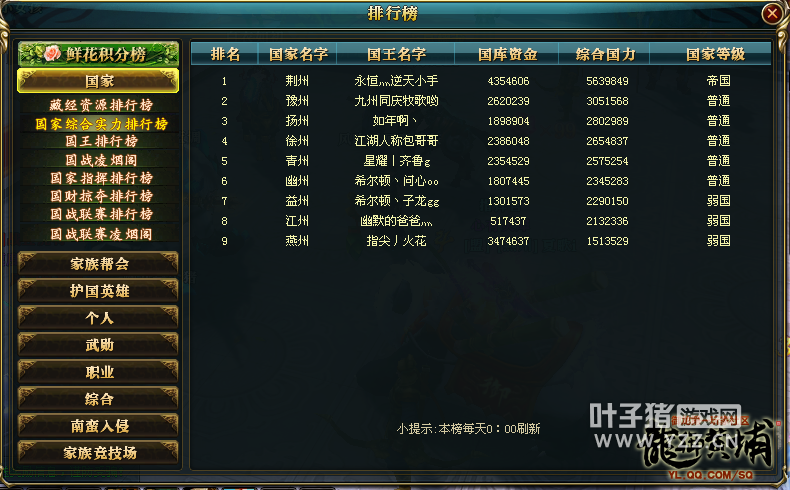 两股势力的简单介绍 原本这个服务器帝国荆州实力最强,也是最有可能拿下皇城的国家,不过进攻皇城的脚步却被一次次的打断,使得帝国荆州不得不与其他国家联合起来,形成以自己国王为中心的帝国势力,其中有盟国燕州,暗盟幽州跟随左右。与之对抗的则是反帝国势力,国家有豫州、扬州、徐州、江州等国,两方势力水火不容,凡是都要互相较劲,皇城的归属当然也不例外。