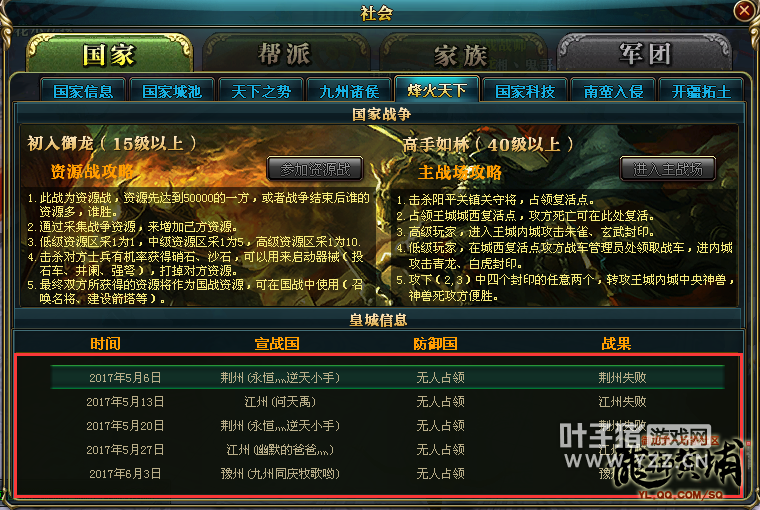 五场皇城战失败,说明激战的惨烈 皇城每个实力国家都想占领,获得荣誉与丰厚的奖励。但是真正可以拿下皇城的国家必须拥有足够的实力,比较新的服务器尤其如此,而帝国荆州则是这个服务器最强国家,志在必得的想要拿下皇城,但是皇城战却成为多国参与的混战,打得格外惨烈。其他国家时而成为守方,时而又成为攻方,时而又成为助力国家,角色变化,但参与的激情不变,投入大量国民,与敌对势力厮杀,战斗到最后一刻。