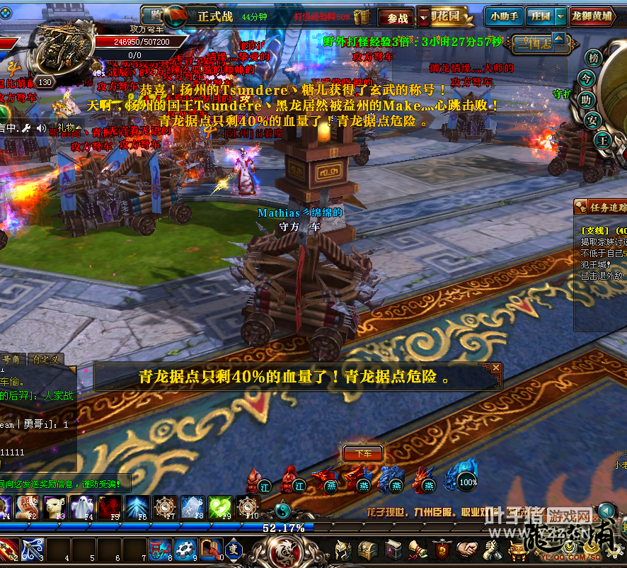 江州在进入王城之后,马上兵分两路,高战直杀内城的朱雀与玄武,大部队就领取战车压到燕州大鼎处,面对燕州、青州的战车直接来一个硬战。很明显的可以看到,在战场上进攻方江州占据优势,其实本土迎战的燕州在领取战车是很方便的,无奈活跃玩家并不多,而盟国青州不可以直接领取战车,只能通过邀请上车子转让的方式,这样很麻烦,也很耽误时间,所以江州的战车很快就杀到内城开始击打白虎青龙,燕州战况很是被动。
