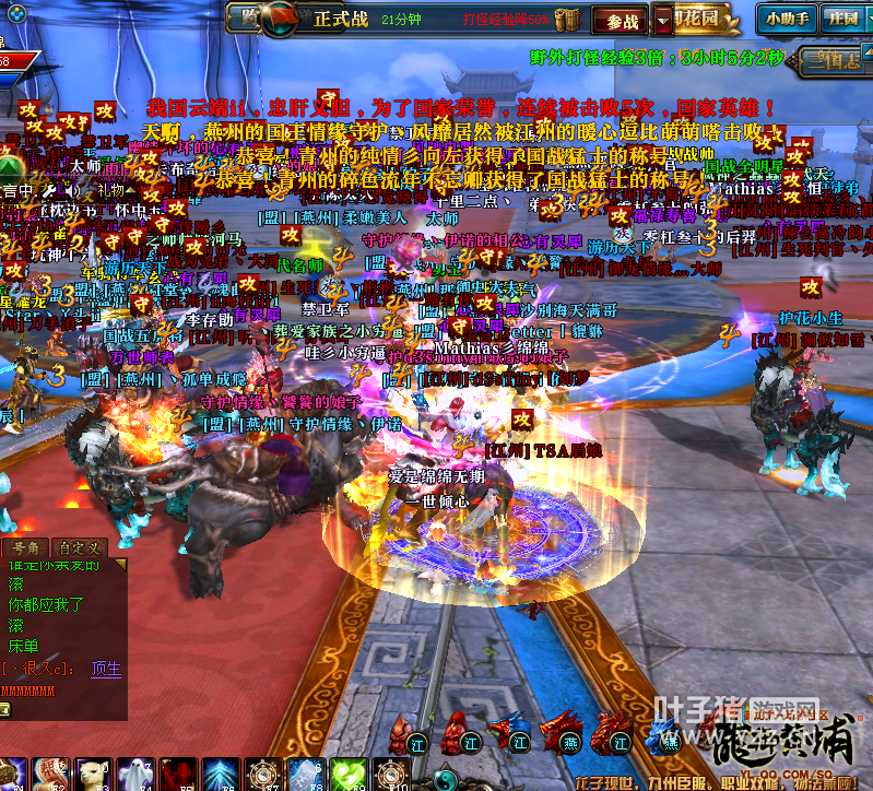 这个时候江州的人物进攻步伐很快,双杀朱雀与玄武之后,集体压到中间击打神兽,燕州只能放弃战车,瞬移回防守朱雀玄武。这样一来,江州的战车更是输出加速,燕州四面受敌,纵使给力的盟国青州也安排到中间帮忙砍杀红名战士,可是随着白虎与青龙的被击杀,根本无法堵挡江州进攻的猛烈。最终,江州非常强悍的1V2获得国战胜利,获得拉燕州大鼎的机会。