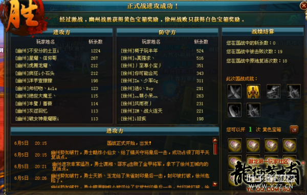 6月5日,【白马银枪】幽州对徐州发起国战,晚上8点刚过,攻守双方国民都在指挥的带领下边境圆盘集结等待,由于攻方幽州国内存在国王帮和反王帮两大势力,所以选择了不同的方式进行指挥,国王帮及散人玩家按照QT命令行事,而反王帮指挥则使用YY调遣成员。很快,幽州反王帮成员率先下边徐州,并在圆盘与徐州国民展开厮杀,随后幽州国王帮也集体下边,此时的徐州大部队,已经被冲散,退守阳平关口,凭借箭塔优势阻击敌人,双方一路厮杀前行,很快到达镇关守将位置,此时幽州的国王帮和反王帮统帅,也达成共识,放下恩怨,通力合作,一切以国家荣誉为重。 8点15分国战正式开始,攻方国民全体起身输出镇关守将,守方国民则尽力击杀红名,可惜攻方火力太猛,镇关很快被爆掉,由于服务器尚处于70级封印阶段,攻方无法通过安全复活直接进入徐州王城,只能一路骑兵模式赶往西门,守方指挥沿途拉令堵截,凭借箭塔优势,斩获了不少武勋,甚至不少国民已经完成了国战杀人任务,很快攻方大军冲到金甲将军位置,保护时间过去的金甲轻松被攻方拿下,西门复活点易主幽州。