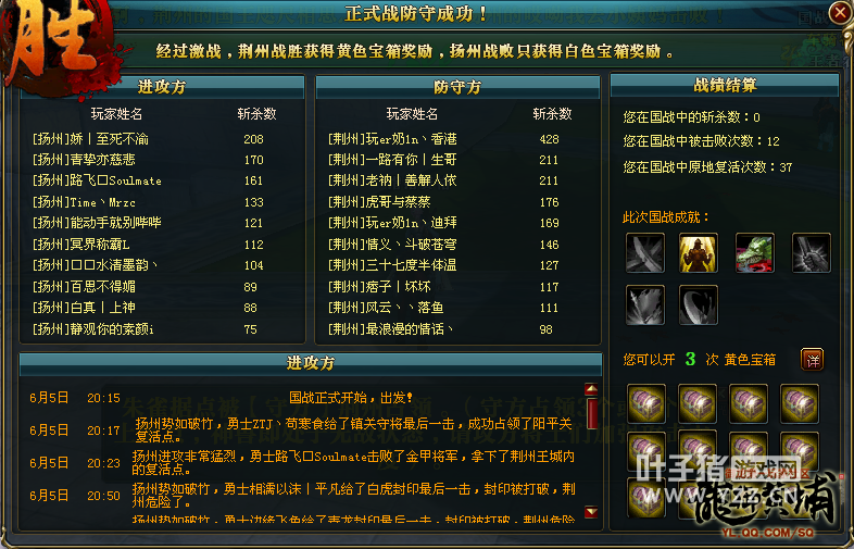 扬州错失机会,最终国战失利 扬州拿下过白虎与青龙,但是没有准确把握时机,也可能扬州指挥失误,导致错失不少次可以攻击国家神兽的机会,最终加时国战时间结束,扬州没有攻下荆州国家神兽,荆州防御国战胜利。