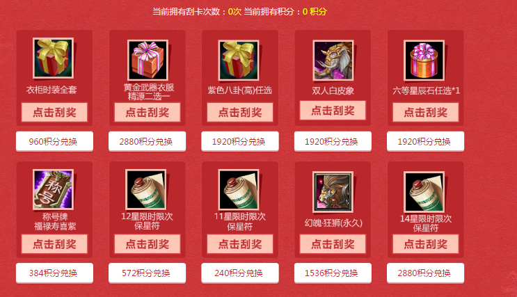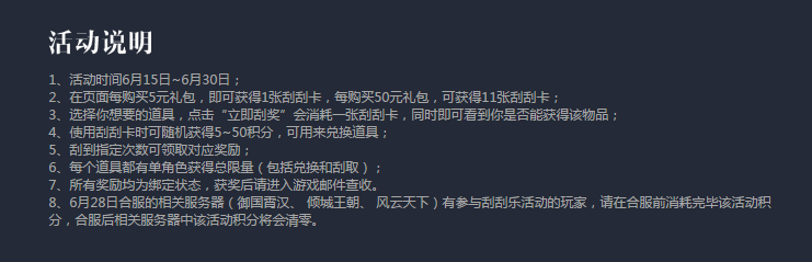 最近御龙的活动真的是一个接着一个出啊!黄金宝箱一口气出了两轮,出完了之后出了消费活动,好不容易15号消费活动结束了。同时超值刮刮乐活动又出来了!一直到这个月月底30号结束。这个刮刮乐和黄金宝箱有着异曲同工之秒。黄金宝箱是5块钱一把黄金钥匙。而这个刮刮乐是5QB一个,但是他会赠送5000工资。花50QB就会送50000的工资。但是会额外赠送一次机会,会有11次刮卡机会哦!而且,第一次在手机的掌上道具城购买50QB,还会额外送一次机会。也就是说50QB,送12次抽奖的机会哦! 而且因为是刮刮乐活动,所以肯定是有中也有失败!,但是只要你刮一次就会送积分,一次是5积分到50积分。如果人品好次次50积分的话,很快就可以获得奖励。而且奖励是十分的丰厚得!有衣柜时装全套,黄金武器衣服精源任选,紫色八卦任选,双人白皮象,六等宝石,福禄寿喜紫,12X保底,11X保底,永久狂狮,14X保底。里面最贵的礼物当然是黄金精源,要2880积分才可以获得奖励。但是如果人品好5块钱就可以获得,那真的是上天了的奖励。而且,刮奖到了一定的次数也有奖励。刮了10次会给紫车经验牌,刮了50次会得到霸王之魄,刮了100次有4000点武魂点,刮了200次会送抱抱。但是这次活动有说明要注意, 每个道具都有单角色获得总限量,所有奖励均为绑定状态,获奖后请进入游戏邮件查收。还有就是6月28日合服的相关服务器(御国霄汉、 倾城王朝、 风云天下)有参与刮刮乐活动的玩家,请在合服前消耗完毕该活动积分,合服后相关服务器中该活动积分将会清零。 这一次活动,其实对于那些缺工资的人来说还是很划算的,因为大家都急着合双属性石头,只要有条件的人,可以去参加这次活动,包你满意哦! [编辑:叶子猪小秘书]