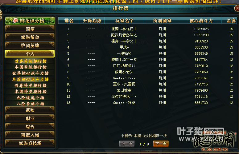 【龙啸九州】荆州国力不是很高,才有210W,国家目前没有18星战将,只有5位15星战将,而且个人战斗力超过1000W也只有两位,属于弱国。【九州皇图】扬州国力有230W,同样也没有18星大神,15星战将只要约7位,不过个人战斗力超过1000W的有4名,属于普通国国力,总体上两国的实力差距不大,就能看谁在战场上发挥得更好了。