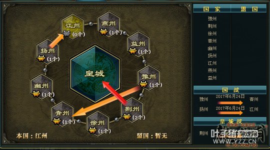 守方:系统(主要国家扬州、燕州) 扬州曾是【烽烟再起】的强国,国力最高之时有五百多万,但扬州国内却并不像荆州那样稳定,而是有狼族和星耀两大帮派争夺王城控制权,最终狼族获胜,扬州开始出现大批量家族和玩家迁移,扬州国力直线下降,很快就跌落到三百万左右,成为【烽烟再起】的弱国。燕州做为扬州的暗盟,国力两百多万,实力相对一般。 6月24日晚上6点左右,皇城战即将开始,荆州QT指挥已经开始上麦动员国民,做好充分的准备。6点20分,荆州玩家在指挥的带领下开始陆续进入洛阳城,并奔向各个点位,等待皇城战的开始。与此同时,扬州和燕州也开始在洛阳城集结,大战一触即发。