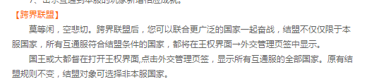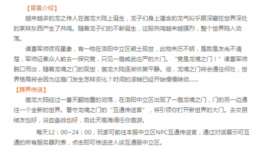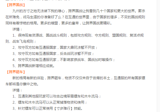 从2017年7月4日以后,双线一区和双线二区每天12:00~24:00,玩家可前往本服中立区NPC互通传送官,通过对话展示可互通的所有服务器列表,点击即可传送进入该互通服中立区。这个给御龙带来了全新的三个改变! Part1.跨服联盟 国王或大都督在打开王权界面,点击外交管理页签,显示所有互通服的全部国家。原有结盟规则不变,结盟对象可选择非本服国家。十八个国家互相结盟,让人想想就觉得很刺激! Part2.跨界国战 跨界国战让我看到几十个国家和更大的世界。厮杀在所难免,戎马生涯的你准备好了么?在互通的世界里,由于国家的增多,不变的国战规则同样有着惊艳的格局。更多的暗盟,更多的皇帝,让跨界国战更精彩。 详情: 1、保持现有资源战、国战战斗规则,包括攻方规则、守方规则、盟国规则、复活点规则、战车飞鸟规则; 2、攻守双方如有互通服国家,国家大鼎玩法暂不开放; 3、攻守双方如有互通服国家,反击战玩法暂不开放; 4、攻守双方如有互通服玩家,不影响家族战车、国战加时等操作; 5、跨界国战新增相应成就。 Part3.跨界砸车 新的格局有新的体验,跨界砸车,物资不仅仅来自于贫瘠的本土,互通服的所有国家镖车都将是你囊中之物。 详情: 1、互通到其他服玩家可以攻击边境军需镖车和木牛流马; 2、镖车和木牛流马可以从正常掉落物资和使用; 3、针对镖车可以正常使用【寸步难行】技能。 可以说这一次的合区让这个游戏恢复了往日的激情,也让一个个死区变得生机勃勃!让我们拭目以待他的精彩吧! [编辑:叶子猪小秘书]