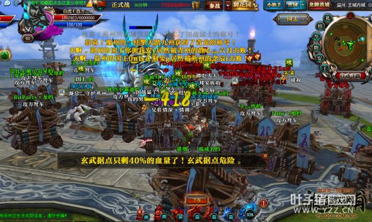 6月26日晚上8点左右,燕州和益州之间的国战即将开始,燕州QT指挥上麦,开始带领燕州玩家下边益州准备国战,此时益州也做出反映,在边境和阳平关展开对燕州的围追堵截,人数似乎并不少。8点15分,国战开始,燕州顶着压力爆掉镇关守将和金甲将军,直接骑兵进入内城,分散开来打朱雀和玄武,很快朱雀和玄武第一波同步,中间神兽激活,燕州压向中间输出,益州王帮在朱雀位置起令防守,中间神兽被打掉10%左右血量之时石化。