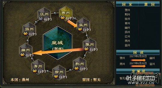 攻方:燕州 燕州是【烽烟再起】的弱国,国力两百一十万,与荆州帝国整整相差近六百万,但燕州并没有因此而屈服于荆州帝国,在刚刚开服就和扬州结为暗盟,对抗荆州帝国,对荆州帝国还是造成了很大的影响,使得荆州木牛流马和国运等活动出现不同程度的损失,所以燕州实力不容小觑。 守方:益州 益州也是【烽烟再起】的弱国,国力三百万左右,不过益州国内似乎并不稳定,从开服直至国战当天,益州已经出现三次换王,所以在国战上,益州更是败多胜少。6月25日,新王上任,益州新王帮士气正盛,6月26日,益州将迎来新王上任的第一场国战,益州能否取得国战胜利,让我们拭目以待。