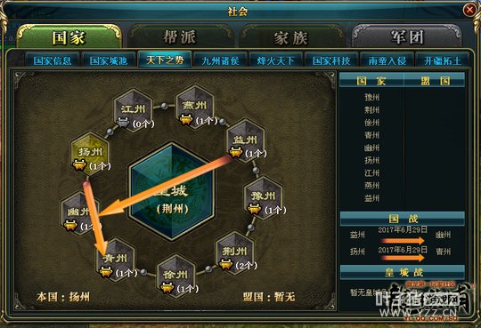 扬州进攻青州国战 扬州弱国进攻青州普通国,看似扬州劣势多,不过扬州作为进攻方主导国战走向,青州防御起来应该也会有着不小的压力。国战开始,扬州快速进攻青州,青州积极防御,不过青州镇关守将与青州王城金甲将军还是被扬州拿下,扬州准备进攻青州内城。