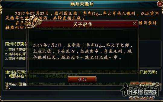 【金玉良缘】在合服之后,九国通过征战,相继确立盟友和敌对关系,并在九州一统大地图上开始吞并城池。7月2日,燕州对豫州发起灭国战,豫州该何去何从,让我们拭目以待。