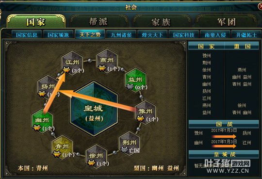 自双线三区朱雀战区【英雄美人】出现三个弱国可以结盟的设定以来,热血战士们在国力不平衡的战况下,增加了更多对抗的机会。 2017年7月3日,幽州携手盟国青州、益州发动了进攻帝国江州的战役,来势汹汹。目前江州并没有盟国,如今的国战易攻难守,而且今天又是3V1的战斗,所以今天对于江州而言是一场严峻的挑战。