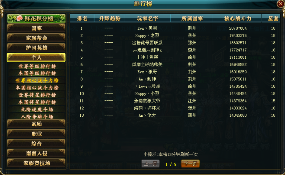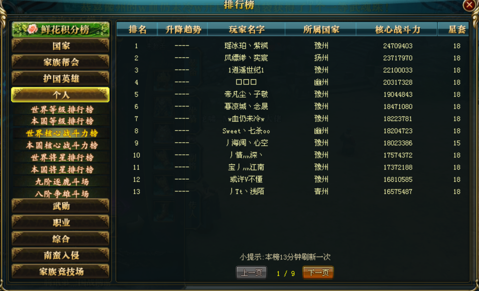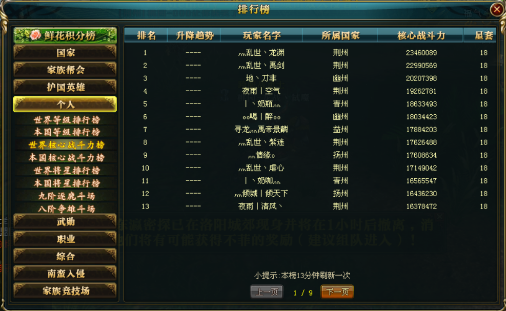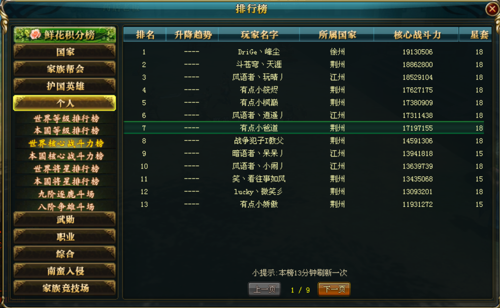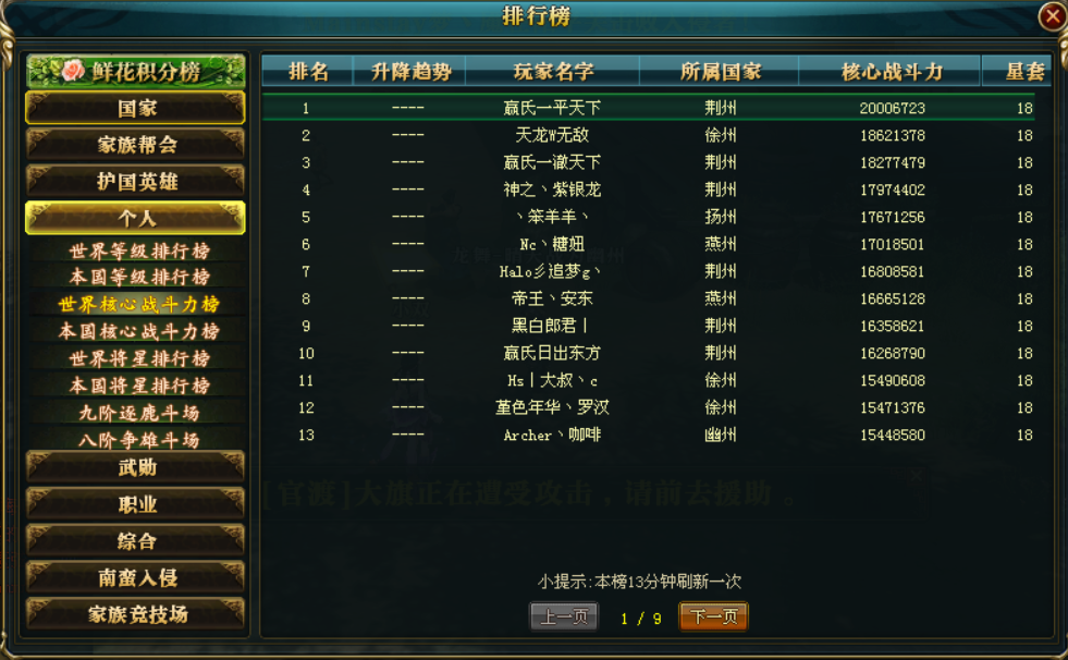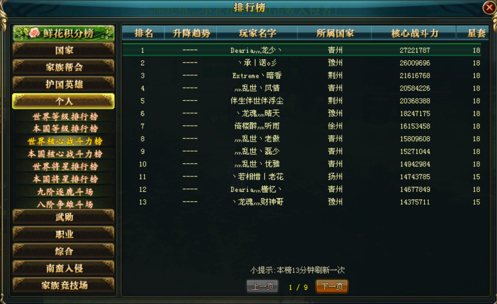 前言: 双线一区青龙战区作为御龙在天公测以来最先开的一批区服,经历了一次又一次的合区,集中了最精英的高战玩家,现如今青龙战区各个服务器均已达到160封印等级。先让我们来看一下各个区服的最精英玩家!(目前青龙战区分为龙啸九州,桃园风云,傲视天下,九州皇图,九州群英,龙舞四海六个服务器。) 【龙啸九州战力榜top13】 【桃园风云战力榜top13】 【傲视天下战力榜top13】 【九州皇图战力榜top13】 【九州群英战力榜top13】 【龙舞四海战力榜top13】 各个区服集中了很多的18x大神玩家,在最顶尖的实力方面,每个区服均有已经达到或者接近2000w战斗力的强力18x大神玩家,我们根据战力排出了青龙战区战斗力top10。 Top10: 所属区服:九州皇图 上榜战力:20584226 【灬乱世丶风情】 Top9: 所属区服:傲视天下 上榜战力:20707604 【Ewx美男】 Top8: 所属区服:九州皇图 上榜战力:21616768 【Extreme丶暗香】 Top7: 所属区服:龙啸九州 上榜战力:22100033 【1逍遥世纪1】 Top6: 所属区服:桃园风云 上榜战力:22990569 【灬乱世丶禹剑】 Top5: 所属区服:桃园风云 上榜战力:23460089 【灬乱世丶龙渊】 Top4: 所属区服:龙啸九州 上榜战力:23717970 【风缥缈丶奕宸】 Top3: 所属区服:龙啸九州 上榜战力:24709403 【瑶冰珀丶紫枫】 Top2: 所属区服:九州皇图 上榜战力:26009636 【丶承丨诺o彡】 Top1: 所属区服:九州皇图 上榜战力:27221787 【Dearia灬龙少丶】 [编辑:叶子猪小秘书]