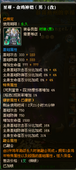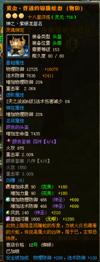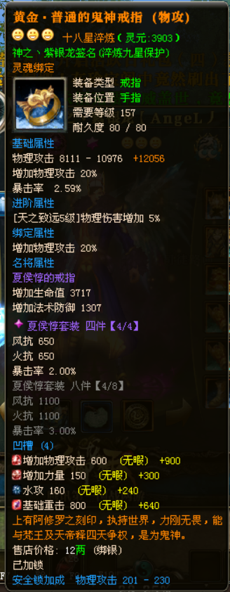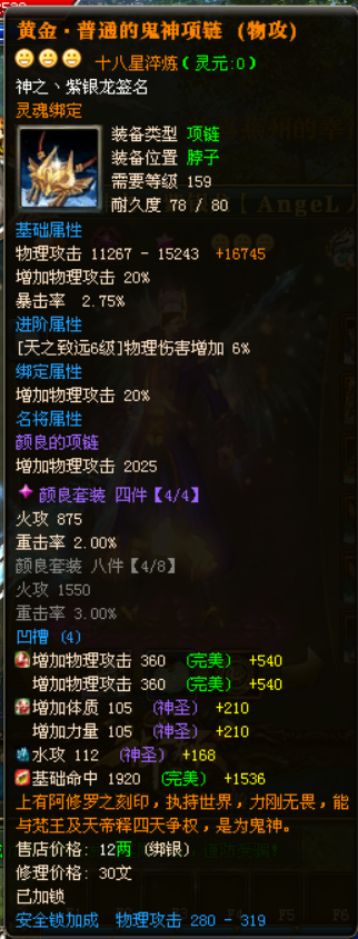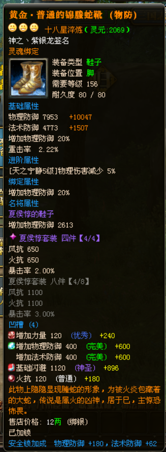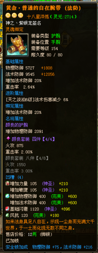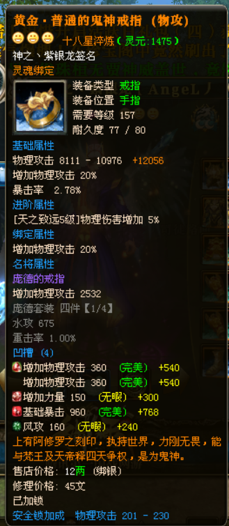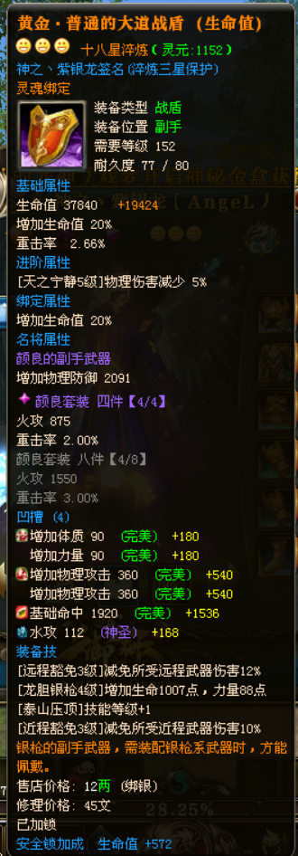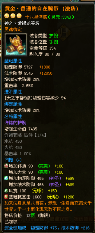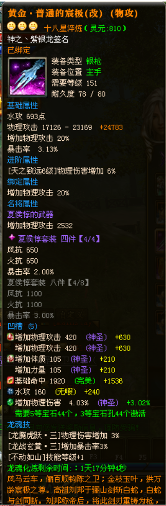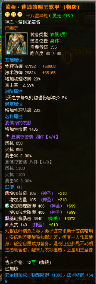 “十八多如狗,十五遍地走,十二不如草“用这句话在龙舞四海最辉煌的时期形容最恰当不过,在别的区服十八星还是凤毛麟角的时代,龙舞四海就开启了大砸星时代,龙域的十八罗汉以及赢式的六大护法再算上其余分布在各国的十八星让龙舞四海的十八星数量傲视全区。 而现在虽然有很多的老牌十八星大神退隐,但是也崛起了不少新的后起之秀。他们同样有着惊人的魄力以及雄厚的财力,荆州国内的神之丶紫银龙就是后起之秀中的佼佼者。神之丶紫银龙本是一个较为低调的强力十五星战神,不知从何日起,”电视“时不时的跳出这位战神的砸星成果,等人们欣赏其装备的时候却是发现这位低调的大神身上的十八星装备一国半数有余,虽说就差几件装备就可以登上御龙的顶峰,但是这位大神还是不急不缓的砸星,致使大神的十八星天尊之路略显漫长了一些。但慢工出细活,大神的十八星装备最终还是全部完工,成功激活了十八星天尊的成就,成为了龙舞四海区内又一位强力的十八星战神。 角色名:神之丶紫银龙 战力:17974402 装备简介:人物黄金橙色十八星(颜良夏侯淳紫色四件套)副将黄金橙色十五星,传人黄金橙色十二星,马庄黄金橙色十三星,紫色八卦六级十六件套,五六等宝石混搭黄色宝石控改造,精良紫十四星披风 [编辑:叶子猪小秘书]